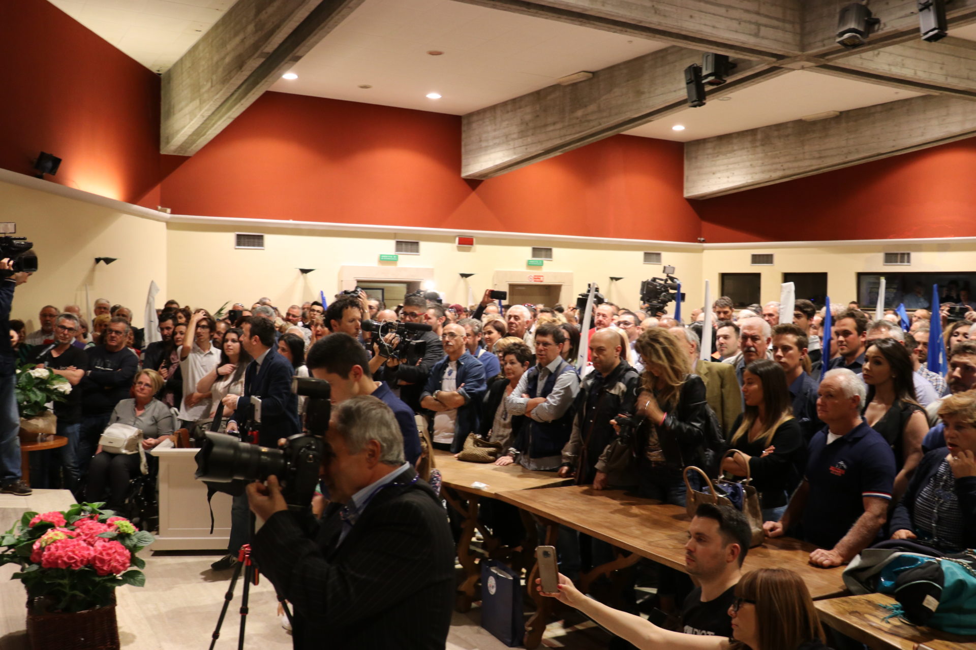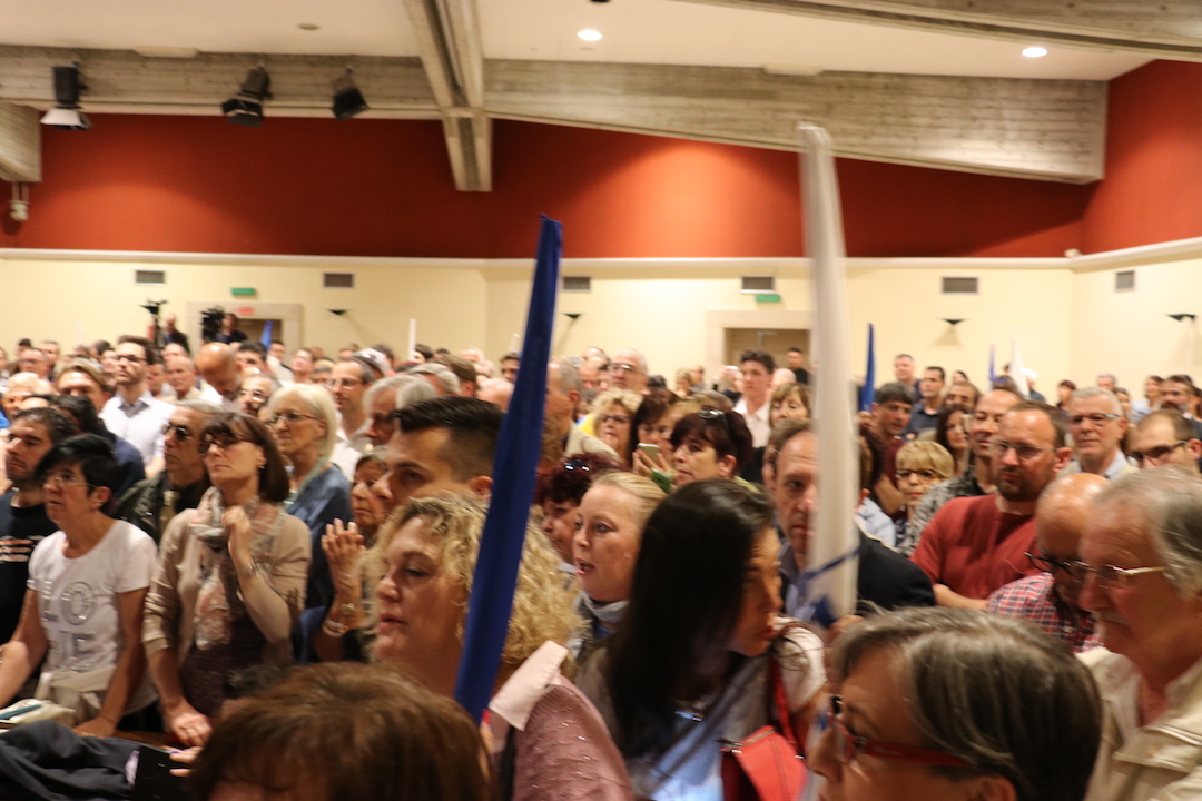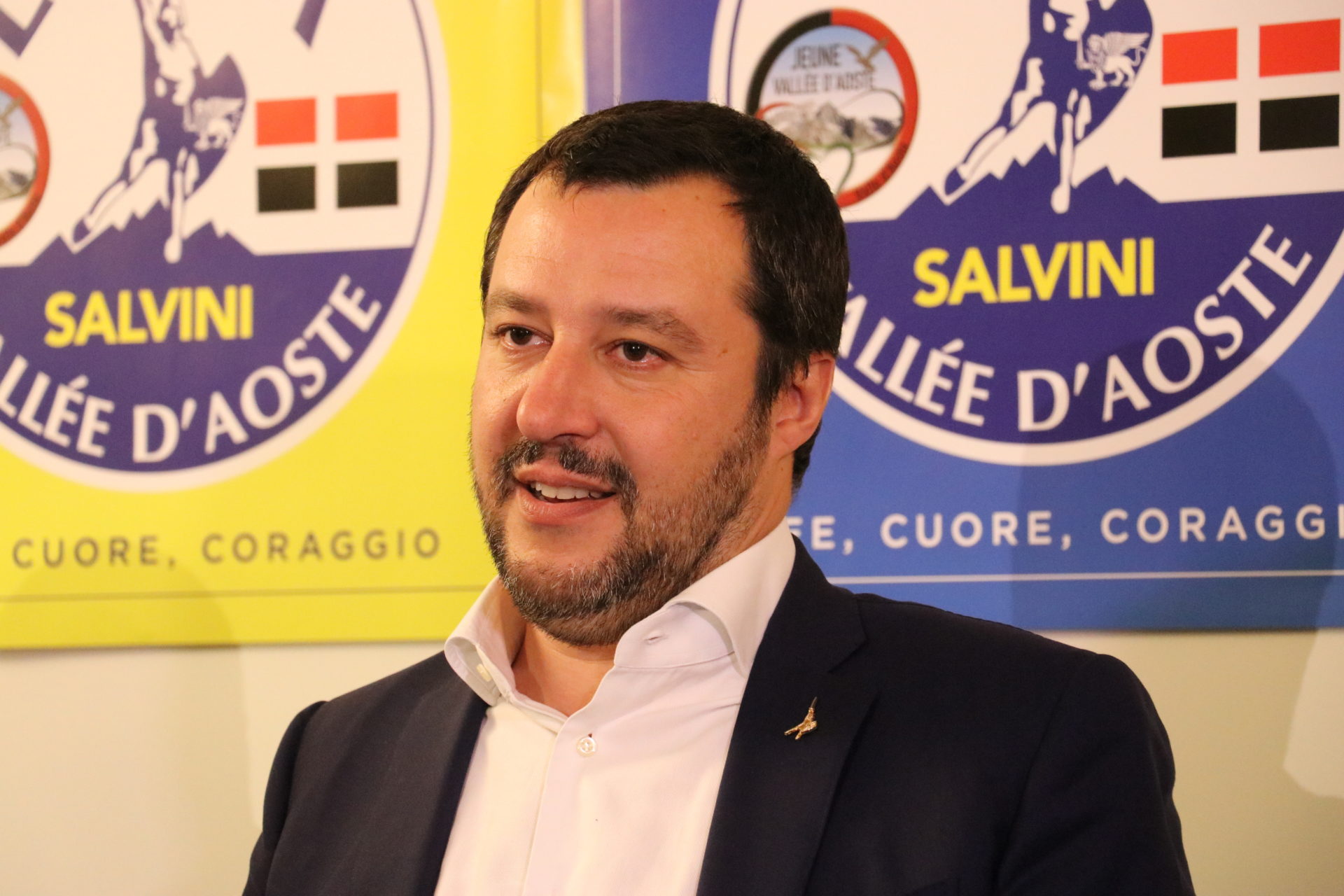 Matteo Salvini arriva ad Aosta quando sono passate le 18. Ad attenderlo all’Hostellerie du Cheval Blanc microfoni e telecamere, a cui si concede nel corso di una conferenza stampa, ma soprattutto tanti cittadini. Nella sala conferenze dell’albergo vengono tolte le poltrone e le persone – più di 500 – si accalcano ai piedi del palco dove di lì a poco il “capitano” entra accompagnato da cori e un lungo applauso, mentre sventolano numerose bandiere della Lega.