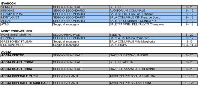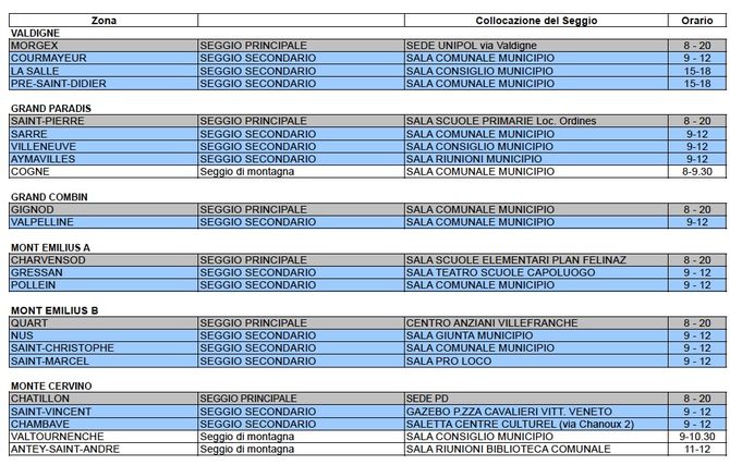 Gli 11 seggi principali resteranno aperti dalle 8 alle 20, mentre i seggi secondari saranno aperti solo mezza giornata; apertura di qualche ora, invece, per i seggi di montagna e per i seggi volanti allestiti preso l’ospedale Parini e l’ospedale Beauregard, grazie al nulla osta concesso dalla Direzione generale dell’azienda USL.