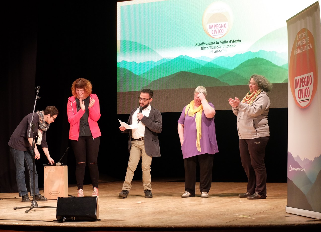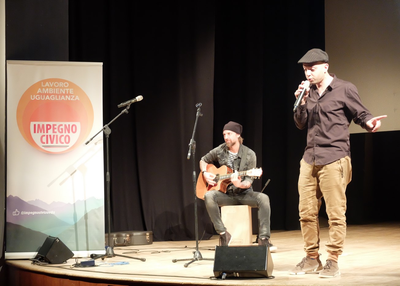 Sul palco, è stata la più giovane candidata della lista, l'avvocato praticante e attrice della compagnia teatrale Palinodie, Giulia Sartore, di 24 anni, a presentare e dar ritmo alla serata, legando assieme temi e programmi della formazione. Sarebbe quasi bastato quello per dare un'idea del messaggio politico, assieme agli intermezzi musicali del rapper Andrea “Sago” Di Renzo e del cantautore Alberto Visconti.