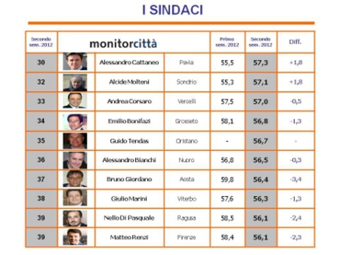 Se nel 2010 Giordano otteneva la dodicesima posizione e nel secondo semestre 2011 era sceso alla 17esima, ora si attesta in 37esima. Ai primi posti, i primi cittadini eletti nell’ultima tornata elettorale del maggio scorso: al primo posto Paolo Perrone (Lecce) al suo secondo mandato con il 64,2%, al secondo Mario Lucini (Como) con il 63,8%, e in terza posizione Vincenzo De Luca (Salerno) con il 63,5%. In quarta posizione Leoluca Orlando (Palermo ) con il 63,0% ed in leggera flessione il sindaco di Reggio Emilia, Graziano Delrio che scende, rispetto al semestre scorso dal terzo al quinto posto.