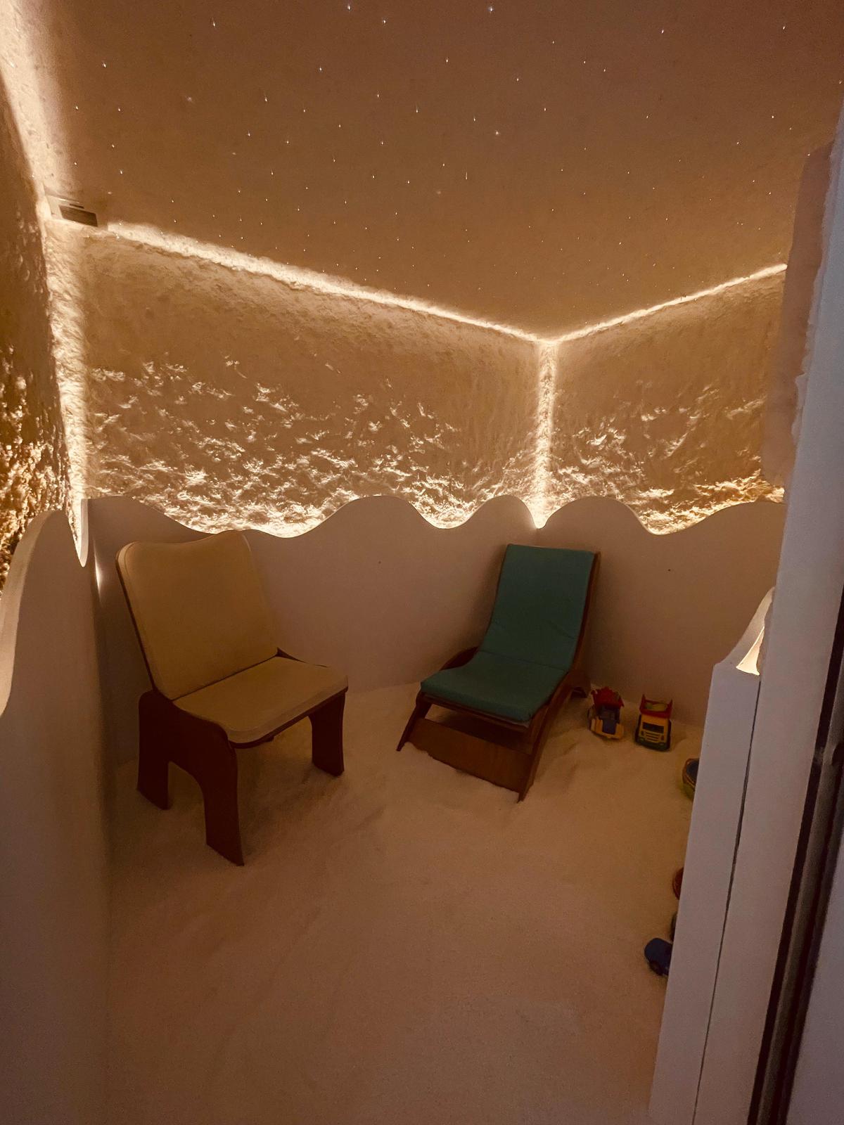 Nella Stanza del Sale si riproduce il microclima di una grotta di sale. L’azione benefica è ottenuta grazie all’azione di un micronizzatore salino a secco che permette di migliorare l’attività respiratoria grazie all’inalazione così come l’assorbimento tramite il contatto con la pelle. Il trattamento è molto semplice, tanto che è possibile entrare vestiti, senza un abbigliamento specifico: basta rilassarsi sulla sdraio ed eventualmente giocare proprio come in spiaggia, insieme ai propri bambini.