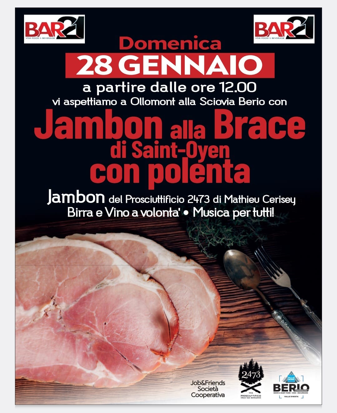 Cucinato dal Bar 21 e servito direttamente nel dehors lo Jambon alla brace, conosciuto da tutti come una delle eccellenze del panorama gastronomico valdostano, potrà essere consumato al piatto o in un panino accompagnato dalla polenta.