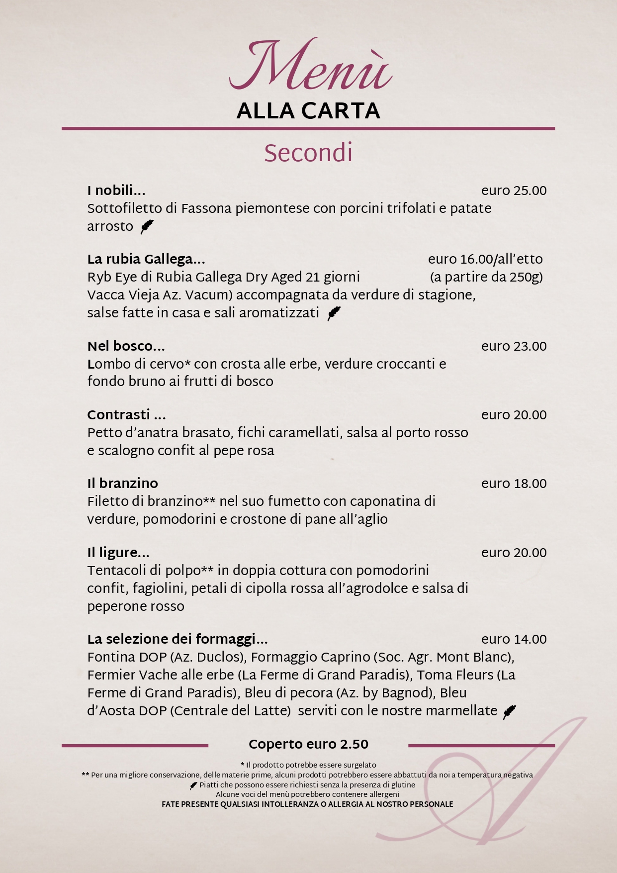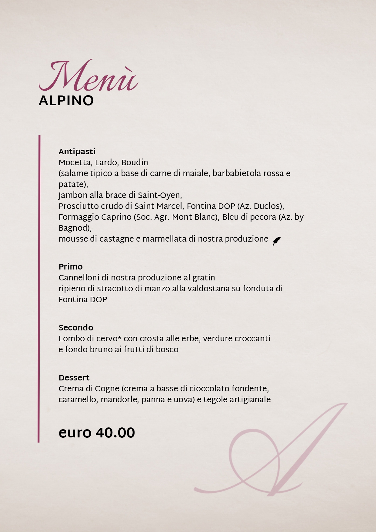 Il ristorante in Via Croce di Città propone un nuovo menù con specialità locali e internazionali da abbinare ai vini della propria cantina. Porcini, pesce fresco, carni mondiali e specialità valdostane vi aspettano nel cuore di Aosta per regalarvi un'esperienza enogastronomica unica.