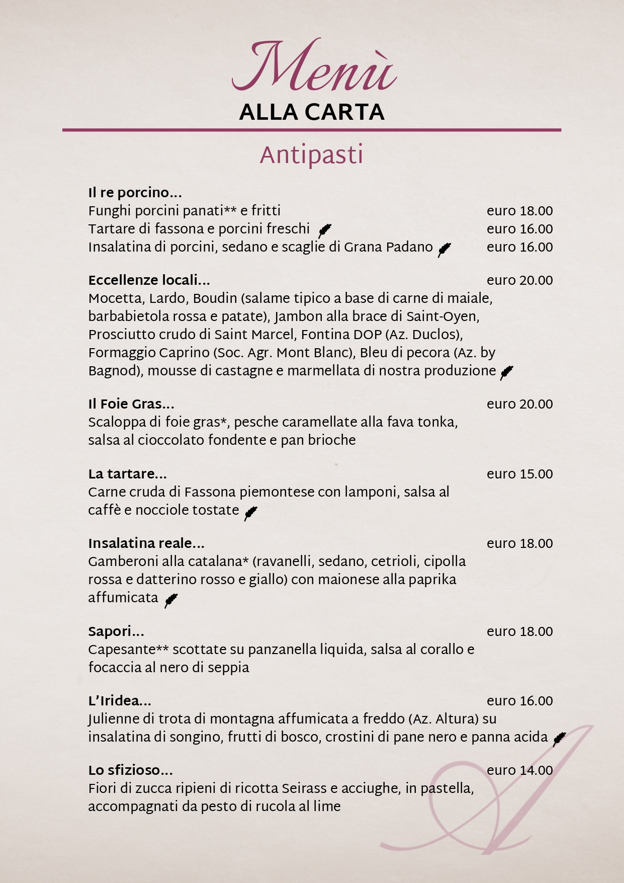 L’offerta estiva si caratterizza per freschezza, raffinatezza e originalità. Oltre alla scelta tra il menù “alpino” dai sapori e profumi tipicamente valdostani e quello “mediterraneo” che fa incursione nella cucina catalana, la proposta dei piatti alla carta è impreziosita da specialità internazionali. Antipasti, primi, secondi e dessert preparati con materie prime di alta qualità e impiattati con cura vi offriranno la possibilità di vivere un percorso gastronomico dalla montagna al mare: porcini, pesce fresco, carni mondiali e specialità valdostane saranno i protagonisti di un’estate di gusto.