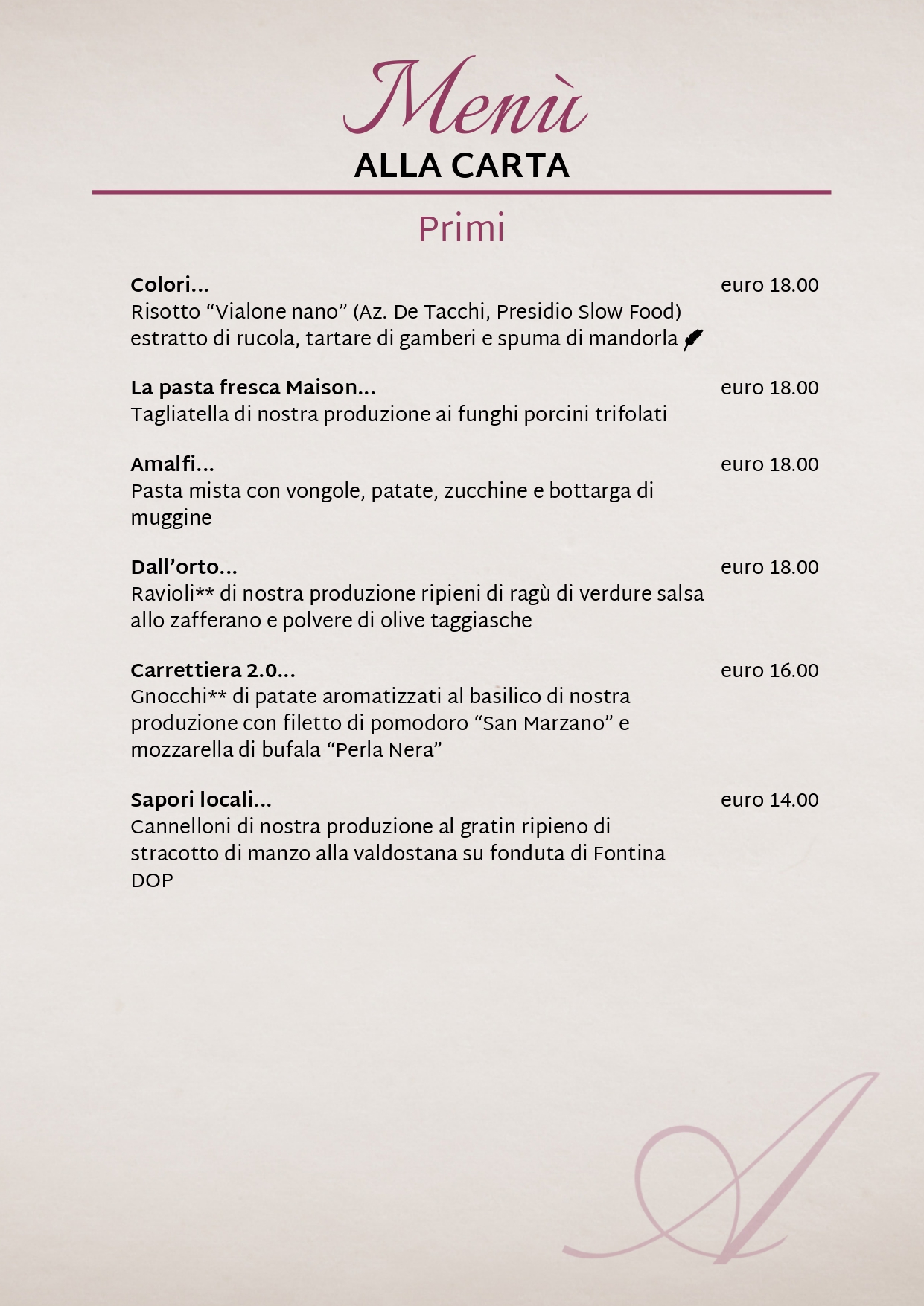 “Sempre pronti a regalarvi emozioni!” – Per la stagione estiva, Aldente aggiorna il proprio menù ma custodisce al proprio cuore la cura nei confronti del cliente. In un dinamico connubio tra tradizione e innovazione che valorizza la cucina nazionale e si apre alle risonanze del mondo, il ristorante nel cuore di Aosta vi aspetta con piatti della classica cucina italiana ed eccellenze internazionali per regalarvi esperienze emozionanti e coinvolgenti.