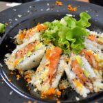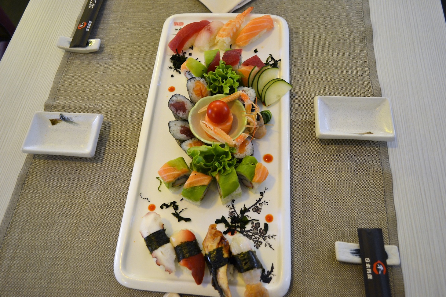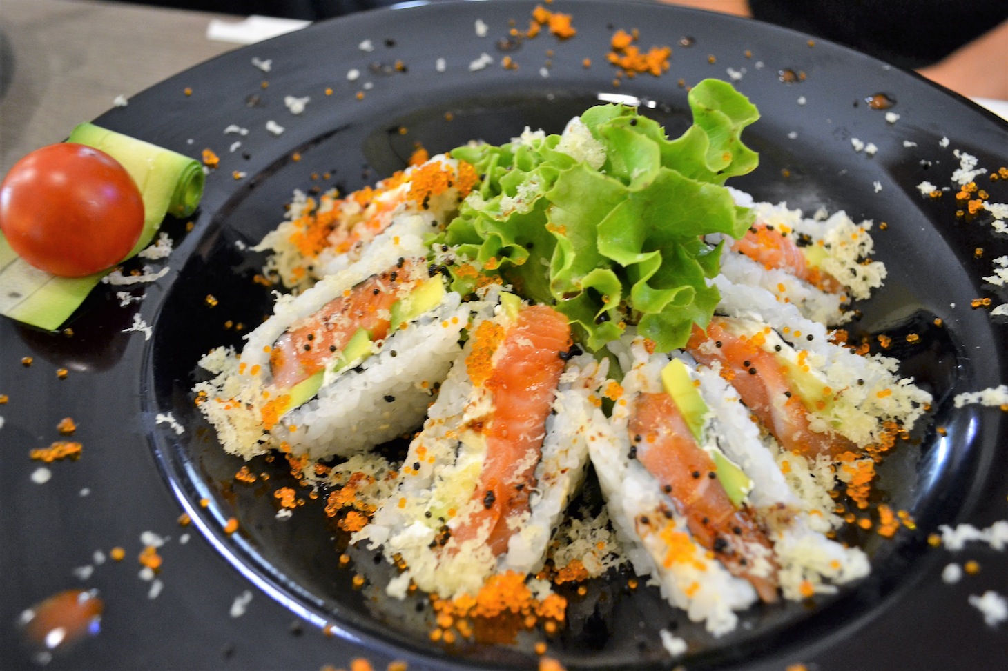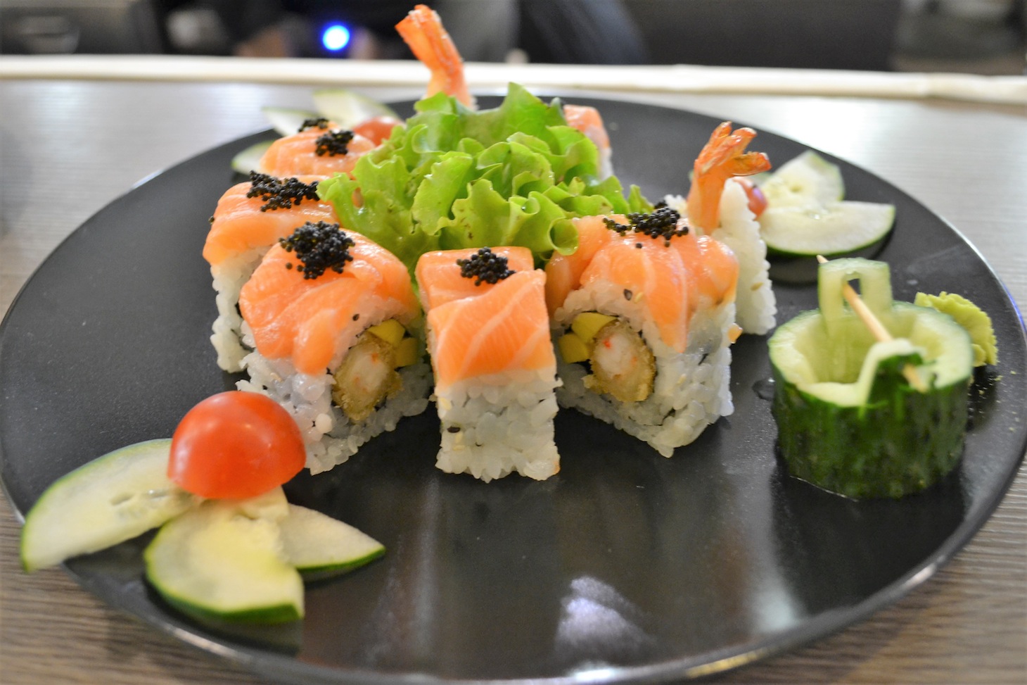 Il locale, che tra dehors e sala interna è in grado di accogliere un centinaio di persone, è sobrio e ispirato ad ambienti semplici. Lo staff è numeroso, in modo da ridurre al massimo i tempi di attesa. Il menù offre davvero solo l’imbarazzo della scelta, con oltre duecentocinquanta portate tra antipasti, riso, udon, ramen e soba, tonkasu, tempura, teppanyaki e una selezione di piatti “fusion” cinesi. Per il Sushi, selezione altrettanto sconfinata con sashimi, uramaki, futomaki, temaki, hossomaki, onigiri, gunkan, hanna, nigiri ed altre proposte a base di pesce, come le tartare, o il carpaccio e il chirashi.