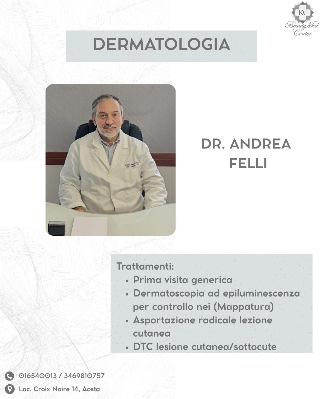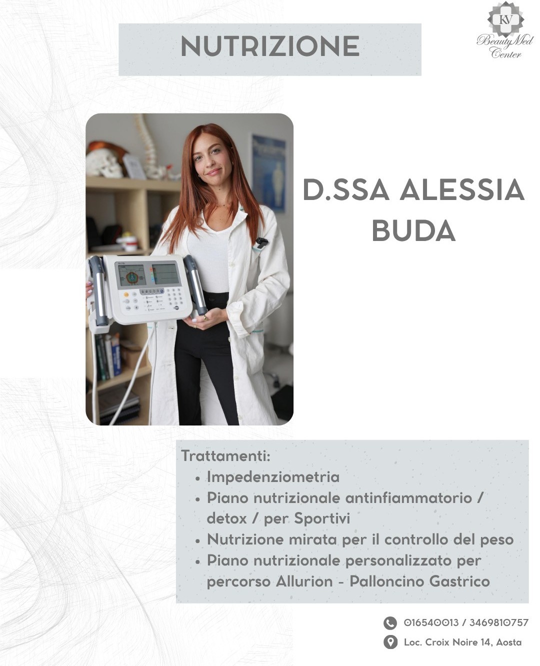 Per fissare una prima valutazione o uno screening su uno dei percorsi proposti è possibile contattare il 0165 40013 oppure recarsi direttamente in sede, ad Aosta, in località Croix Noire 14. Il centro è presente anche sulle pagine ufficiali social, sull’App BeautyMed Center Aosta, scaricabile dagli store, e sul portale MioDottore.