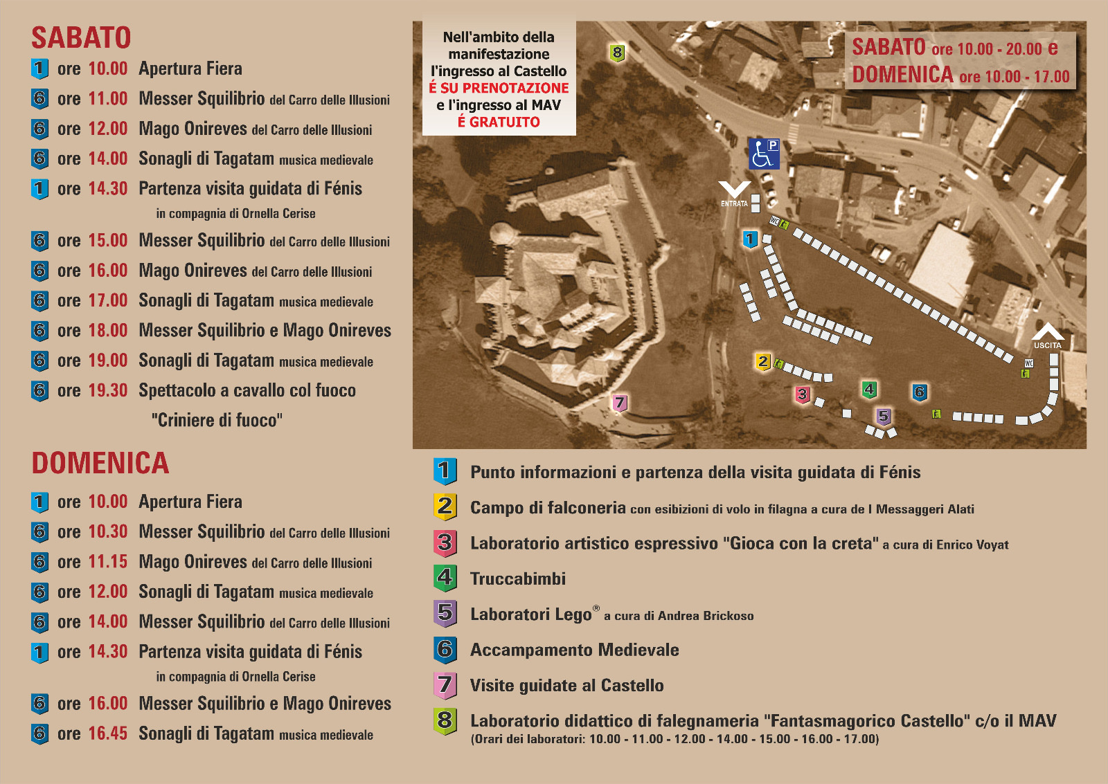 Ma Castello in Fiera non finisce certo qui: ad arricchire l’evento sarà una lunga e assodata serie di iniziative collaterali anch’esse appositamente pensate in chiave medievale. Oltre agli spettacoli di magia medievale e di funanbolismo firmati da Messer Squilibrio e dal Mago Onireves del Carro delle Illusioni, a lasciare i presenti a bocca aperta saranno anche le roventi esibizioni a cavallo delle Criniere di fuoco e le melodie dei Sonagli di Tagatam. Il prato sottostante il Castello di Fénis ospiterà in aggiunta il campo di falconeria de I Messaggeri Alati e il laboratorio artistico-espressivo “Gioca con la creta” curato da Enrico Voyat; ad allietare ulteriormente le giornate di festa dei bambini saranno le postazioni dedite al truccabimbi e alle sculture di palloncini nonché il simpatico pony Semola.