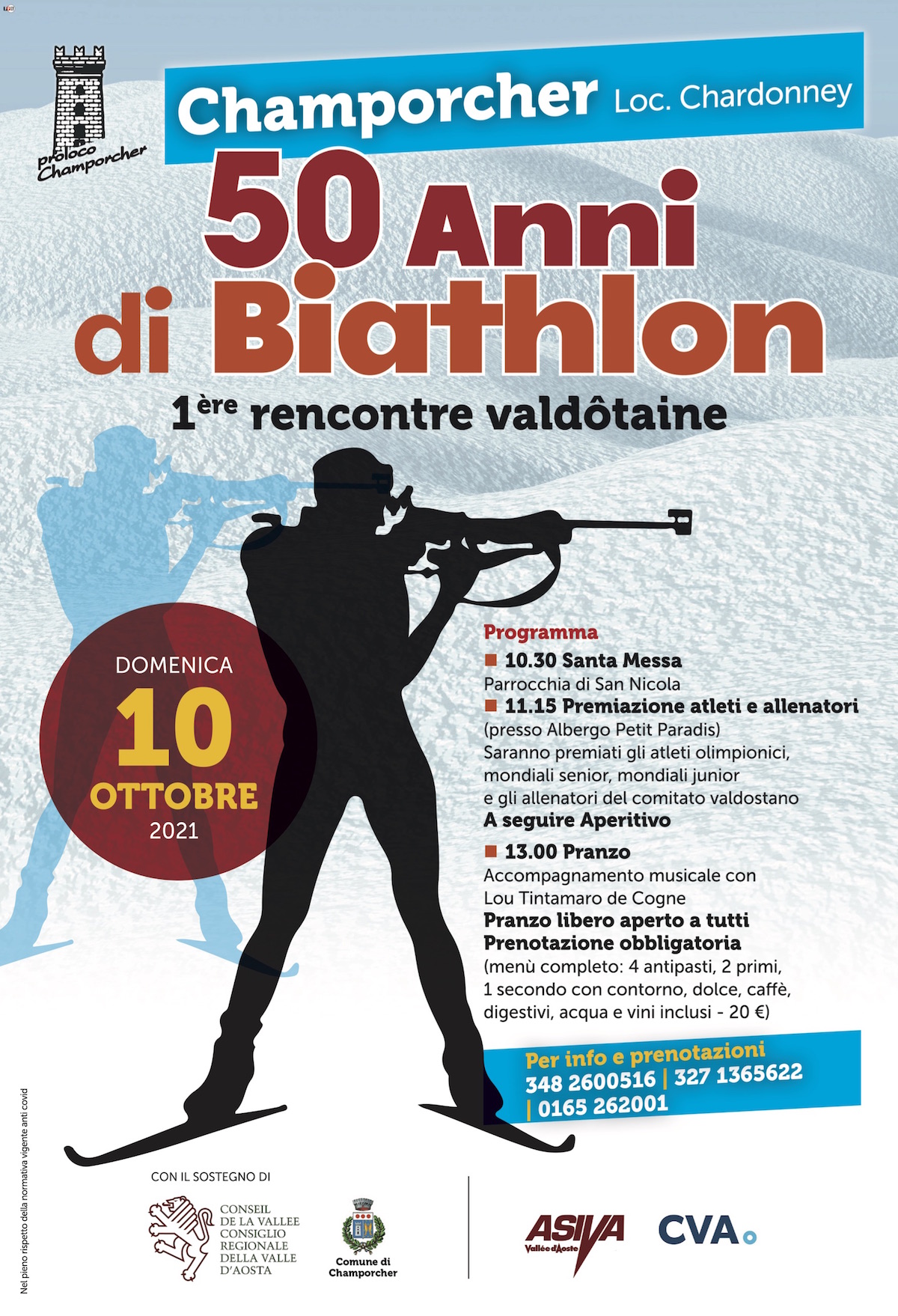 Manca poco all’inizio della stagione sportiva invernale e, finalmente, dopo lo stop del 2020 si potrà ritornare sulle piste da sci alpino, ma non solo. Tra le discipline sportive i più care ai valdostani, ma meno conosciute dai turisti, c’è il biathlon. Da cinquant’anni gli atleti di questo sport rappresentano egregiamente la Valle d’Aosta nelle gare internazionali, nelle coppe italiane e anche alle olimpiadi. Per festeggiare il cinquantenario della fondazione della società, la pro loco di Champorcher, insieme ad ASIVA Valle d’Aosta e alla CVA, con il sostegno del Comune di Champorcher e della Regione Valle d’Aosta, ha organizzato la première rencontre valdôtaine di biathlon. L’evento vuole riunire tutti gli appassionati di questo sport e celebrare i successi degli atleti e della federazione sportiva regionale.