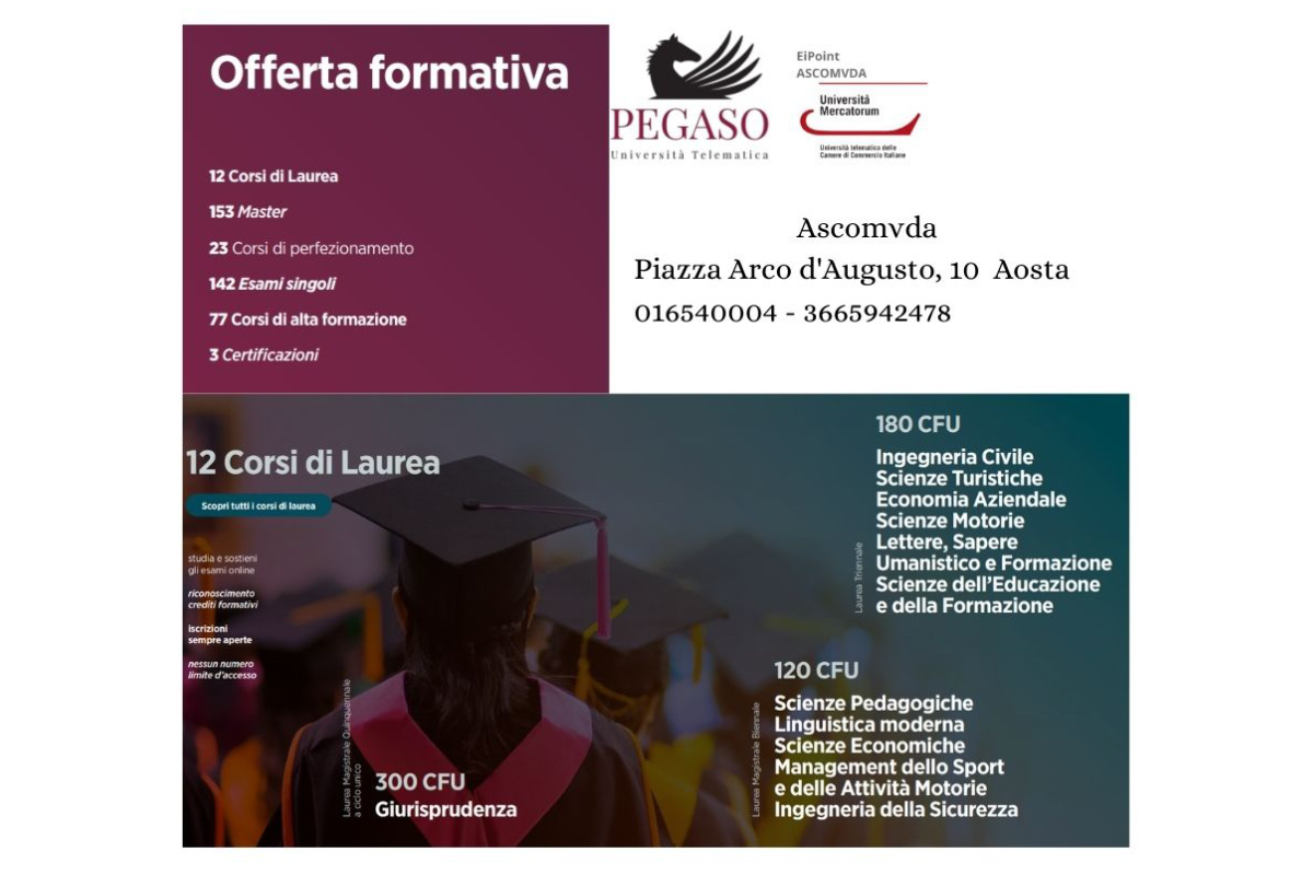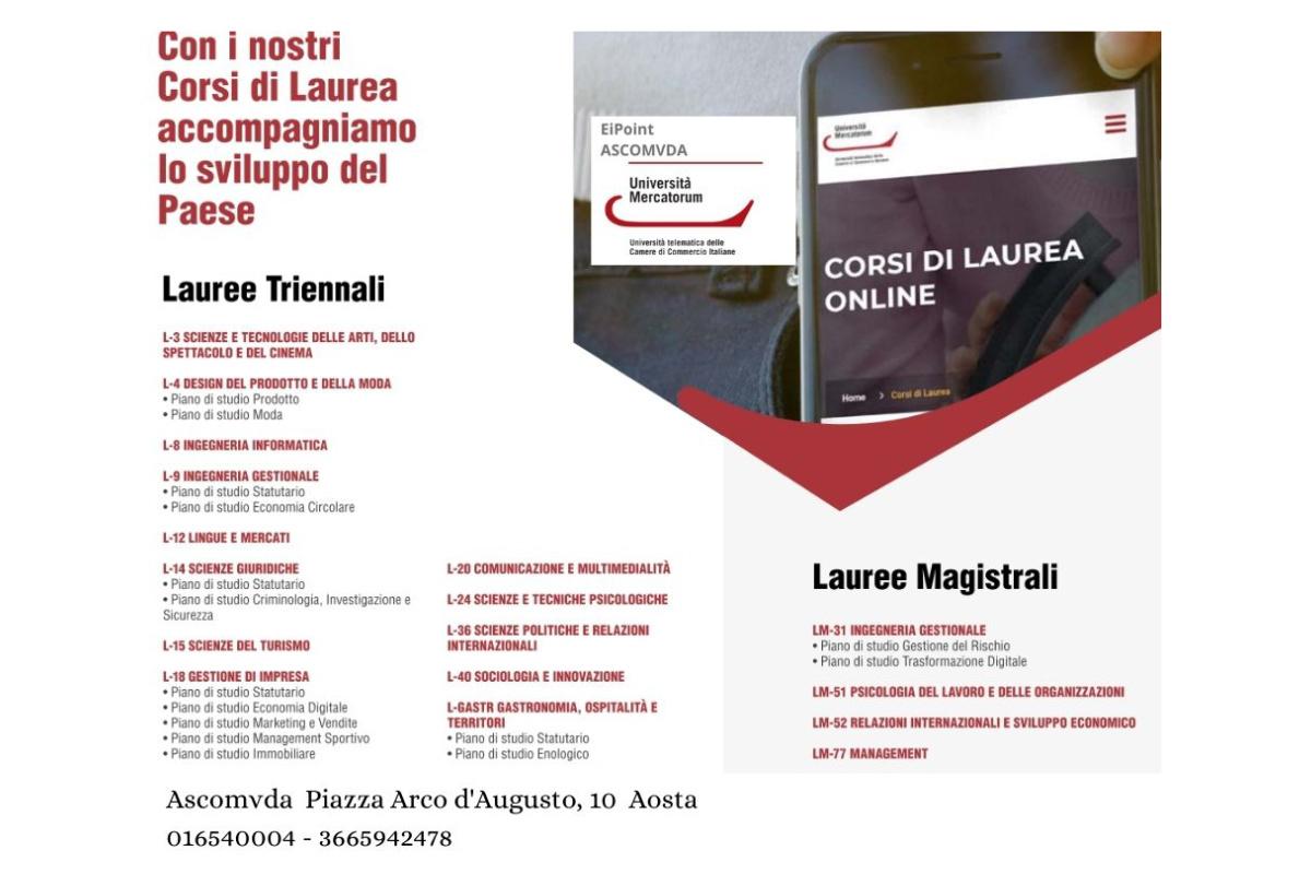 Una vera e propria “Università del lavoro e del Made in Italy”, come spiega il Presidente di Confcommercio VdA Graziano Dominidiato: “Questa è un’opportunità molto valida e importante per la nostra regione, e che permetterà ai cittadini più o meno giovani di proseguire il proprio percorso di studi, soprattutto per chi ha iniziato presto il suo percorso lavorativo. Mercatorum è in grado di fornire risposte a chi vuole trovare nei percorsi di studio ulteriori possibilità di qualificazione, migliorando la posizione nella propria azienda o sul posto di lavoro”.