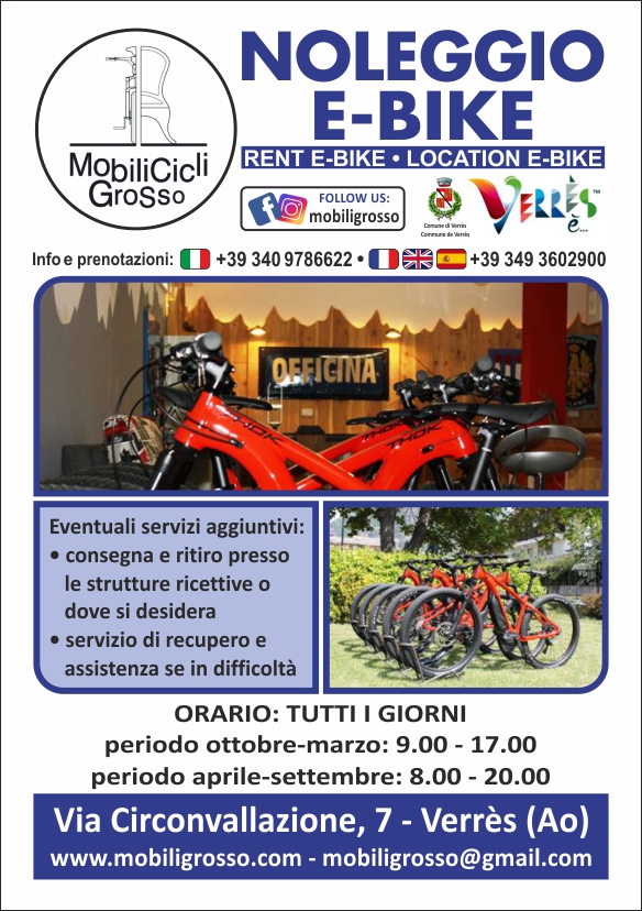 Da un giretto semplice lungo un ru fino a itinerari più impegnativi, le dieci e-bike a disposizione di Mobili Cicli Grosso, la cui attività è aperta tutto l’anno, è l’ideale per godere della natura in maniera sostenibile e unica, lungo i panorami che offre la regione.