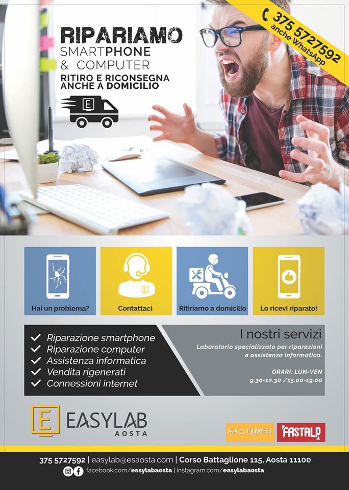 EasyLab, il negozio di corso Battaglione, ad Aosta, è più che un negozio di informatica. È infatti il luogo ideale per assicurare al proprio smartphone e al proprio computer – sempre più importanti oggi, non solo per mantenere i rapporti sociali ma anche per la didattica a distanza delle scuole e per lo “smart working” – di svolgere il proprio ruolo appieno.