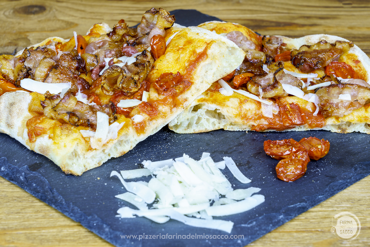 Ultima, ma non per importanza, la pizza che prende il nome stesso del locale: la Farina del mio sacco, semplice quanto gustosa, farcita con fior di latte, scamorza affumicata, salsiccia, noci (fuori cottura), Auricchio piccante e basilico.