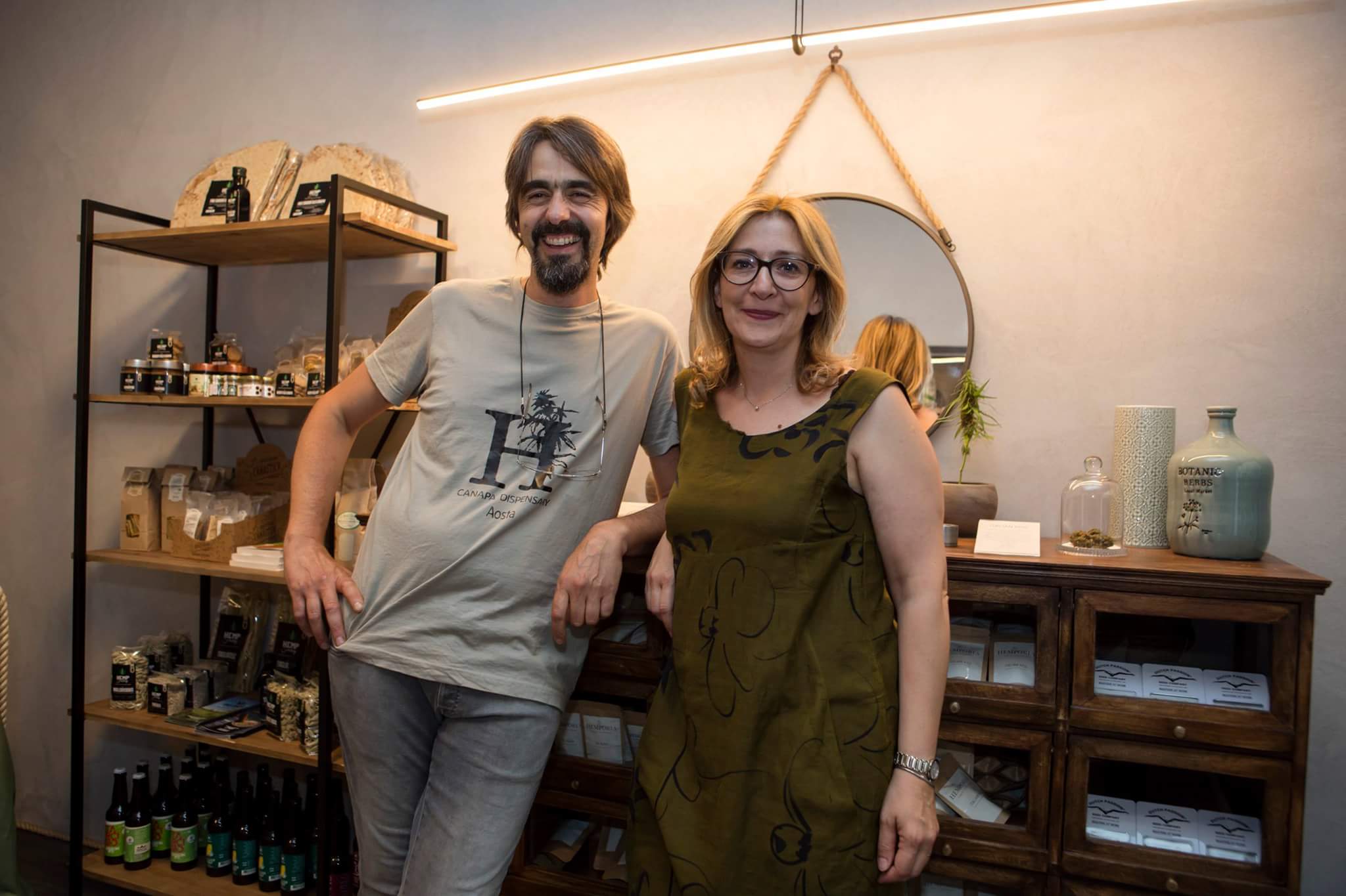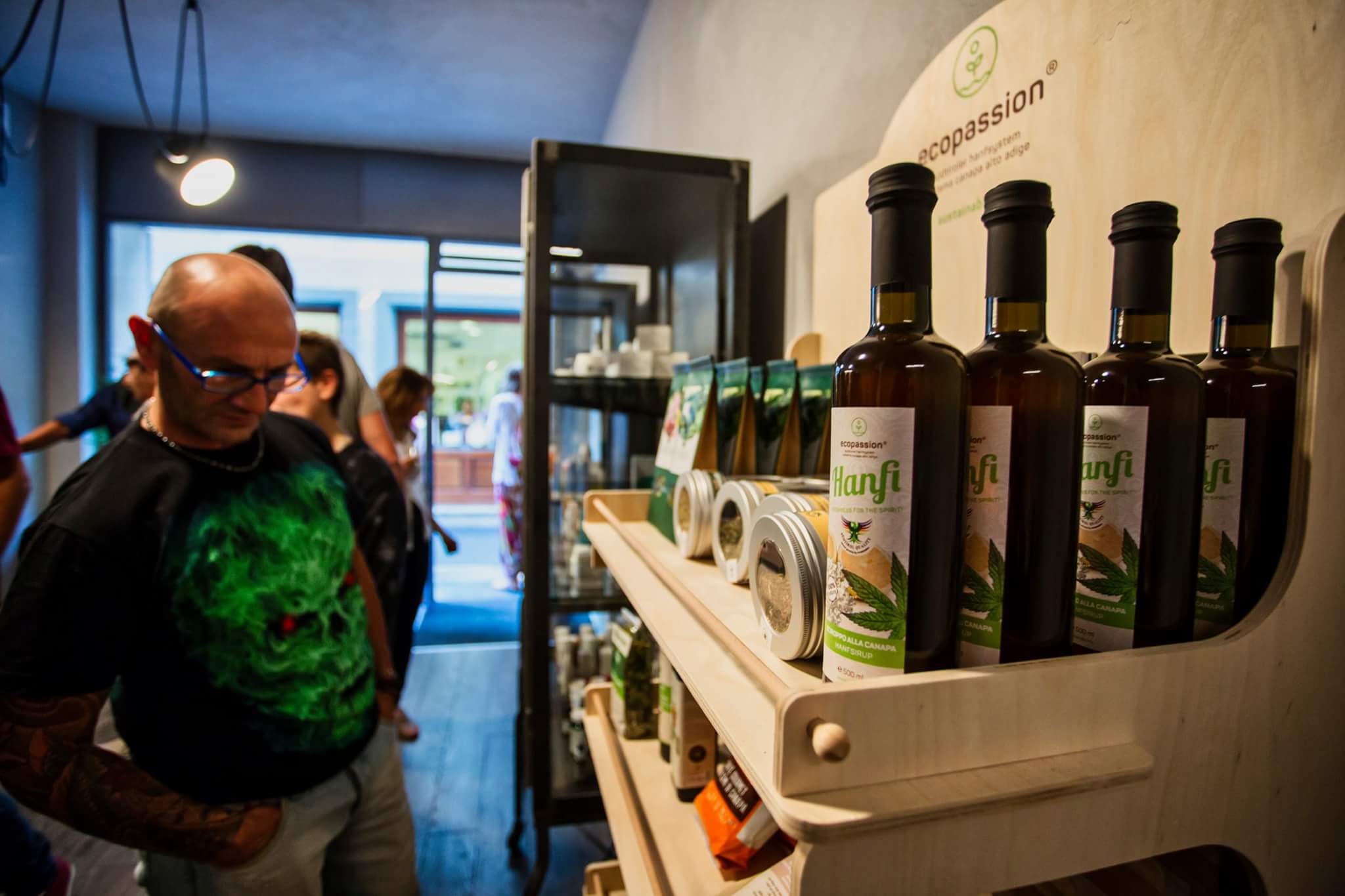 Giuliano e Nicoletta, da dietro al bancone, oltre ad offrire una degustazione dei loro prodotti, hanno spiegato ai presenti le virtù della canapa sativa, una pianta legale tornata in circolazione grazie ad una legge del 2016 (la 242/2016) che ha consentito nuovamente la coltivazione in Italia delle varietà che sviluppano nel fiore un livello molto basso di THC, il principio a cui sono associati gli effetti psicoattivi.