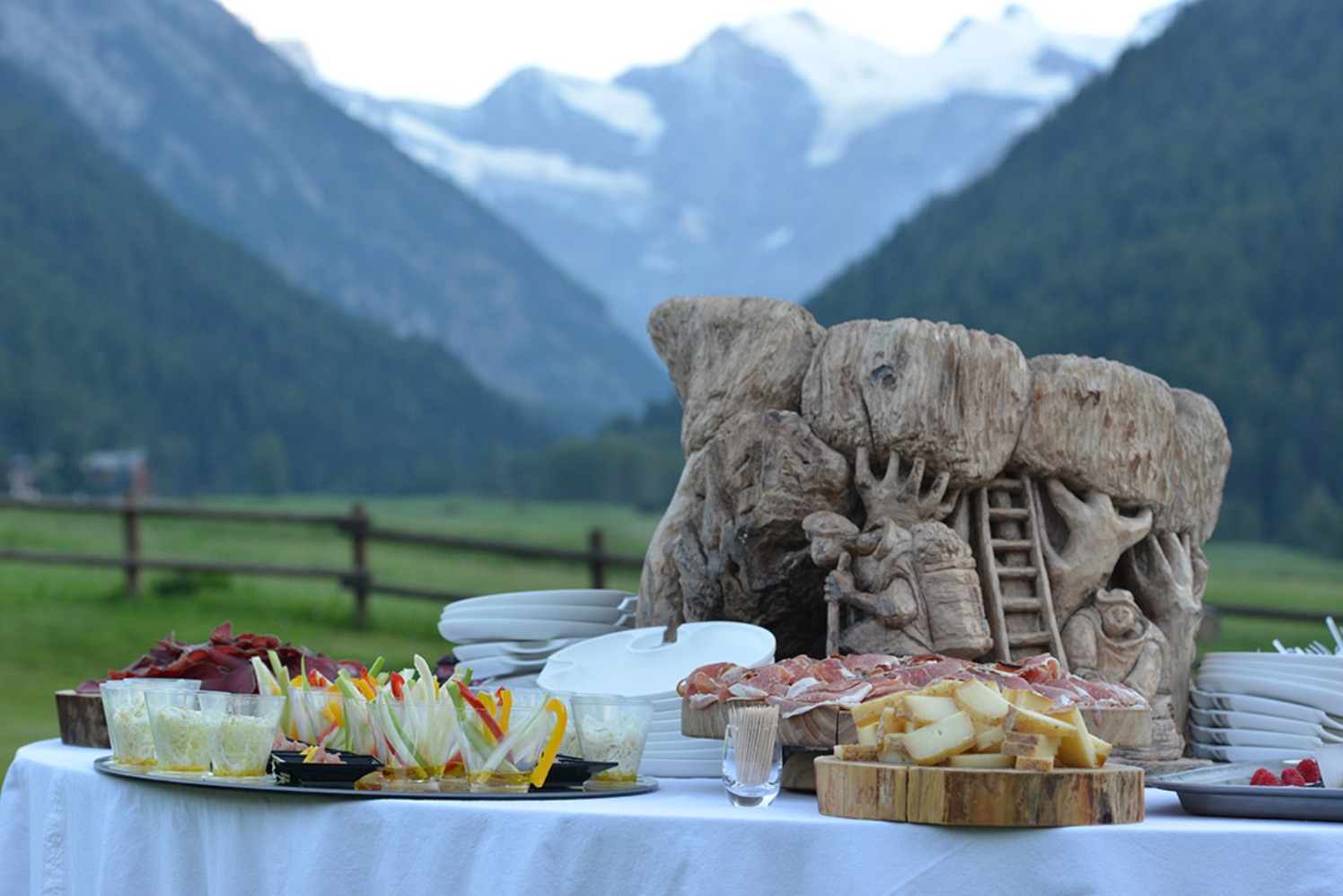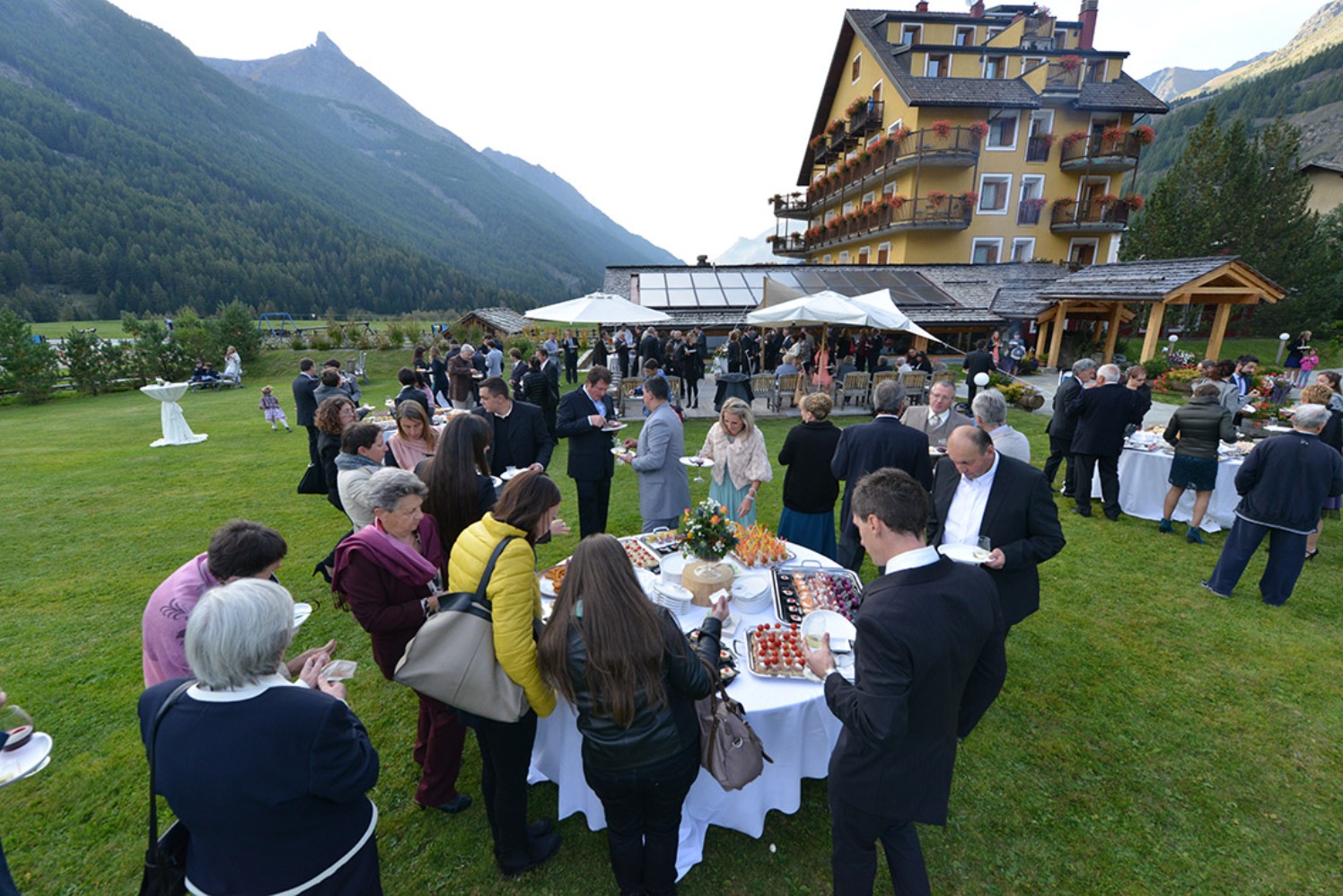 Ad innalzare ancora di più il livello di questo vero e proprio sogno sono la professionalità e l’attenzione al cliente da parte della famiglia Gérard, che gestisce l’hotel, ed anche la qualità e la varietà dei cibi forniti durante il ricevimento. Un aperitivo, che è stata ribattezzato “Aperantipasto Sant’Orso”, a base di finger food preparati con maestria e creatività dallo Chef Raffaele Baldini, che propone deliziose invenzioni a base di prodotti tipici locali reinterpretati in chiave inedita e stupefacente, oltre a ostriche, gamberi e verdure in tempura preparati sul momento, crudo tagliato al coltello con grissini del Gran Paradiso, vini valdostani, o la tipica crema di Cogne. Una delizia per il palato che si sposa con la gioia per la vista.