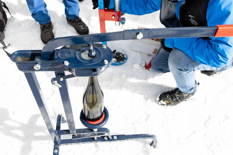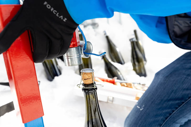 La pressatura dell’uva e la prima fermentazione del vino, che si prepara a diventare Cuvée des Guides, avvengono nella cantina di Morgex. Verso giugno, il vino sale invece in funivia e arriva alla prima stazione di Skyway Monte Bianco per svolgere la presa di spuma e la seconda fermentazione per diventare spumante. Qui riposa poi 36 mesi e dopo un accurato Remuage – l’operazione che fa scendere i lieviti sul collo della bottiglia per poi essere congelati ed eliminati dalla stessa – alcune bottiglie vengono portate a Punta Helbronner, nella neve, per effettuare il dégorgement che inaugurerà la nuova annata.