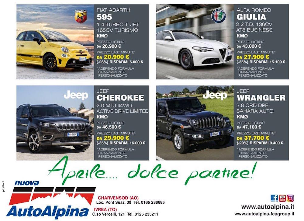 “Aprile… dolce partire!” è lo slogan scelto da Nuova Auto Alpina S.r.l. per salutare la primavera, nelle sue concessionarie di Charvensod ed Ivrea, in cui da oltre trent’anni è al servizio degli automobilisti. Per chi vuole mettersi in moto, sono quattro le proposte imperdibili, legate a vetture a km 0 di marchi che non hanno bisogno di presentazioni: Fiat Abarth, Alfa Romeo e Jeep.