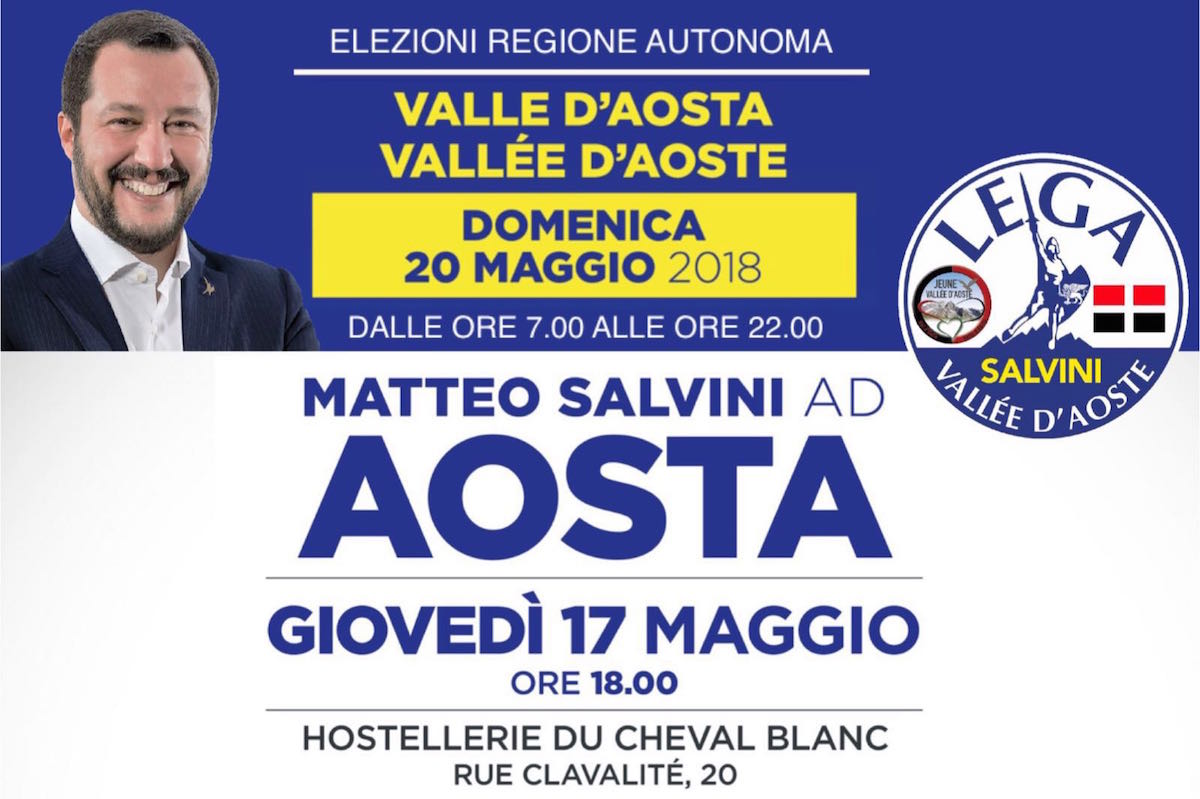 Il segretario federale della Lega, Matteo Salvini, sarà presente giovedì 17 maggio, alle ore 18, presso l’Hostellerie du Cheval Blanc, ad Aosta, per testimoniare la sua vicinanza alla Valle d’Aosta ed al progetto della Lega per le elezioni regionali del 20 maggio.