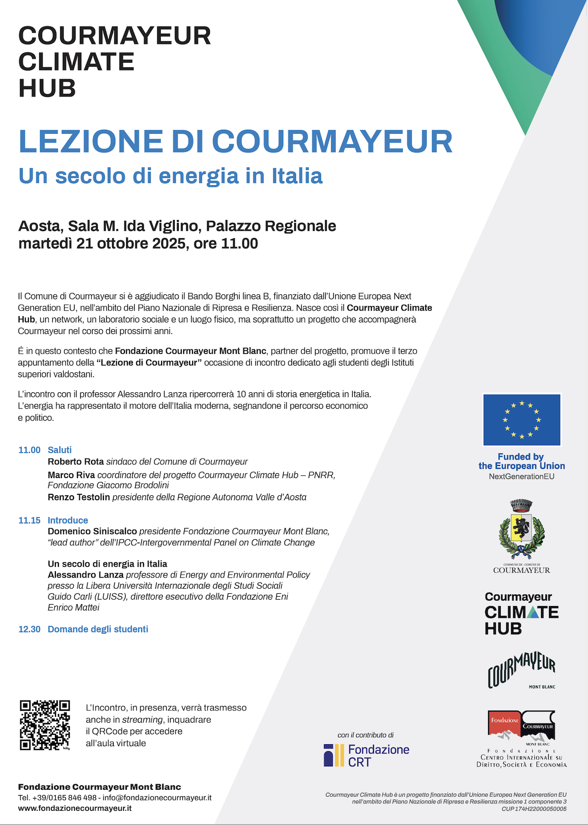 Il Ciclo Lezione di Courmayeur, promosso dalla Fondazione negli anni 2023 e 2024 nell’ambito del progetto PNRR Courmayeur Climate Hub, prosegue nel 2025 con incontri dedicati agli studenti degli Istituti superiori valdostani e volti ad approfondire tematiche di attualità, con l’obiettivo di mettere in luce le sfide e le opportunità per le generazioni future, in un periodo storico caratterizzato da cambiamenti ambientali profondi.