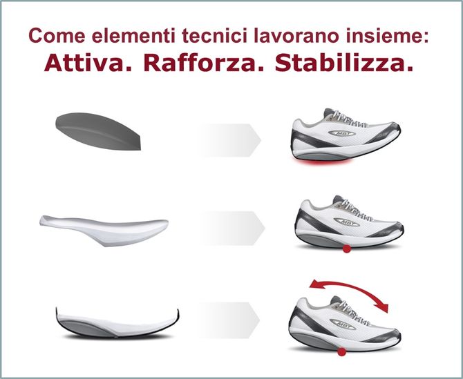 Il segreto delle calzature MBT risiede nella tecnologia della suola multistrato che incorpora il Masai Sensor, un particolare cuscinetto che, riproducendo gli effetti della naturale camminata sulla sabbia, crea un’instabilità alla quale il corpo risponde automaticamente con un incremento dell’attività muscolare che si traduce a sua volta in una maggiore stabilità.