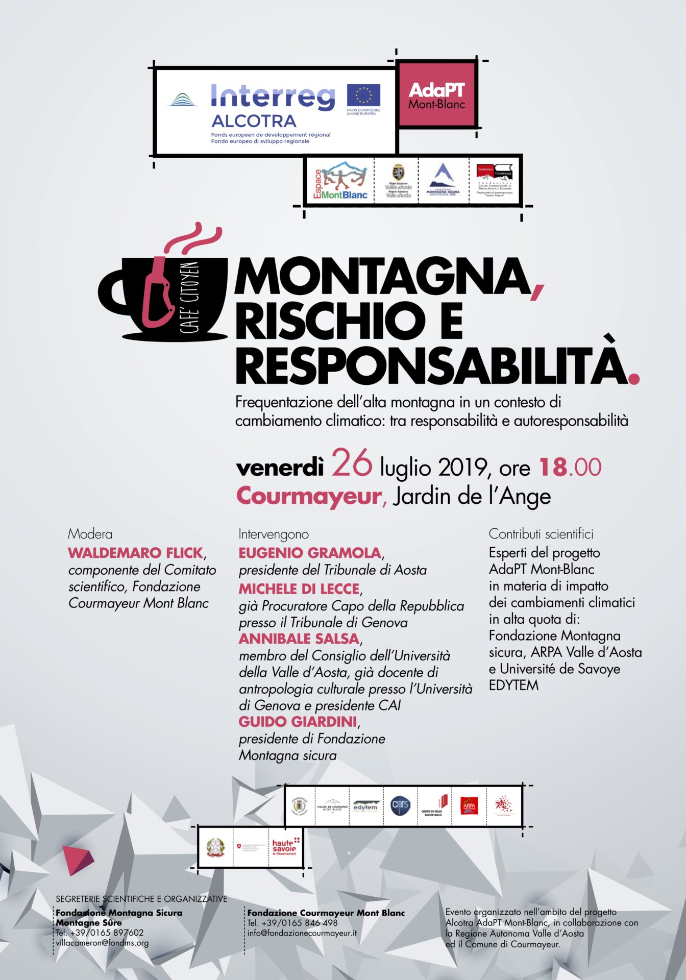 Saranno soprattutto questi aspetti legati alla responsabilità ed all’autoresponsabilità della frequentazione dell’alta montagna in un contesto di cambiamento climatico ad essere analizzati, venerdì 26 luglio alle 18, nell’incontro aperto al pubblico “Montagna, rischio e responsabilità”. Ad ospitare l’evento, organizzato dalle Fondazioni Montagna Sicura e Courmayeur Mont Blanc , in collaborazione con Regione Autonoma Valle d’Aosta e Comune di Courmayeur, nell’ambito del progetto ALCOTRA AdaPT Mont-Blanc, sarà il Jardin de l’Ange di Courmayeur.