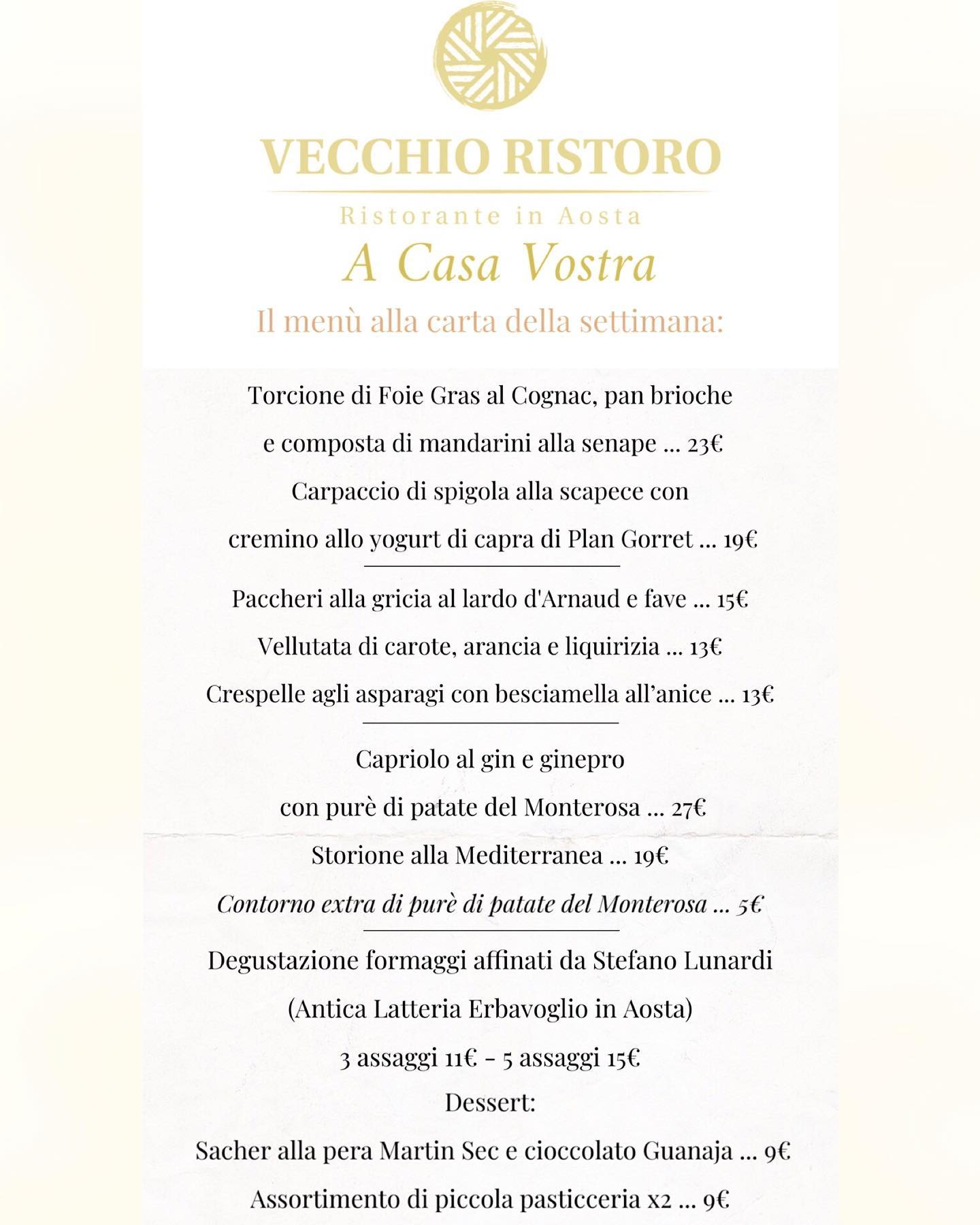 A regalare un prezioso momento di Alta cucina nelle case di tutti i valdostani è il Vecchio Ristoro, lo storico locale di via Tourneuve, ad Aosta, che con la nuova gestione di Filippo Oggioni e Paolo Bariani ha deciso di “uscire dalle sue mura” per portare tutto il suo sapere culinario a casa dei clienti.