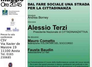 Venerdì 8 maggio presso la sala conferenze del Csv della Valle d’Aosta alle ore 20,45 un incontro sul rapporto tra comunicazione e trasformazione sociale. Relatore Alessio Terzi, Presidente nazionale di Cittadinanzattiva.