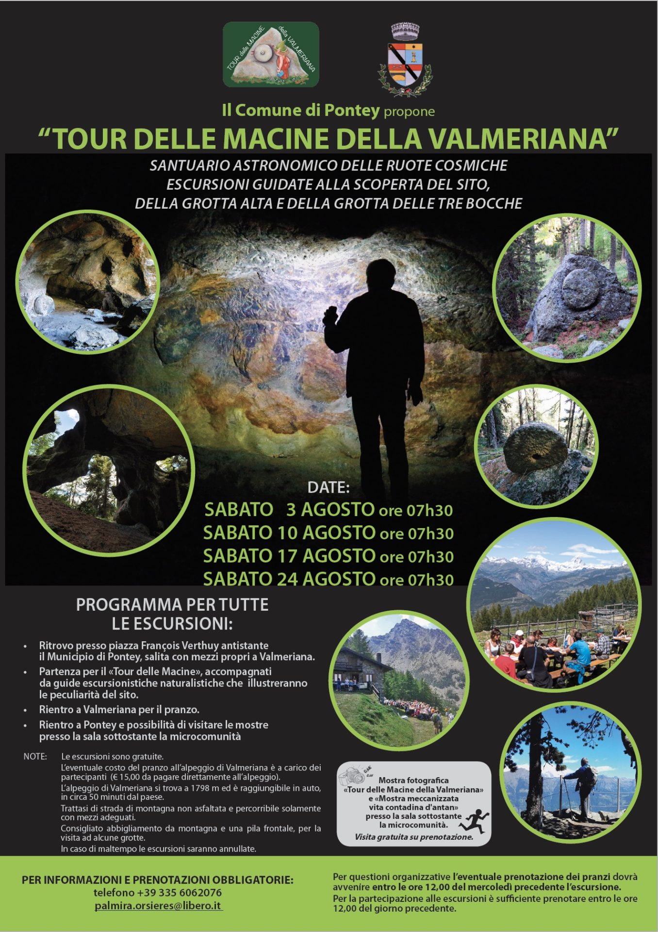 Con questo obiettivo il Comune di Pontey organizza nel mese di agosto quattro visite guidate lungo un percorso caratteristico e suggestivo sia per la disponibilità di centinaia di resti di “macine” nel terreno e ancora abbozzate nelle pareti di roccia o nelle grotte, sia per la stupenda vista sul fondovalle e sul Cervino che l’itinerario consente.