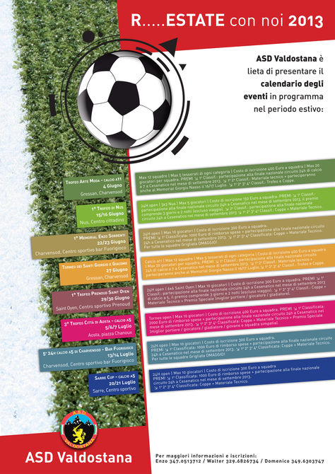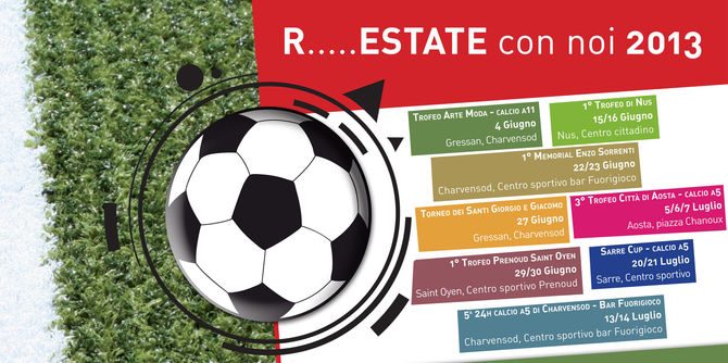 E’ tutto pronto per il fischio d’inizio della lunga stagione estiva di eventi sportivi organizzati dall’Associazione Sportiva Dilettantistica Valdostana. Il cartellone di “R…estate con noi 2013” è ricco di novità, con ben otto tornei concentrati in soli sessanta giorni, tra giugno e luglio, che declineranno il gioco del calcio in varianti originali e divertenti: dalle 24 ore non stop di calcio a 5 ai tornei su due giorni, passando per le mini sfide tre contro tre fino alle classiche partite a undici giocatori, ci sarà solo l’imbarazzo della scelta. In palio, come al solito, tante coppe e materiale tecnico, oltre alla possibilità di partecipare, per le prime classificate di ogni evento, alla finale nazionale del circuito 24 ore di calcio che si disputerà a Cesenatico il 7 settembre 2013.