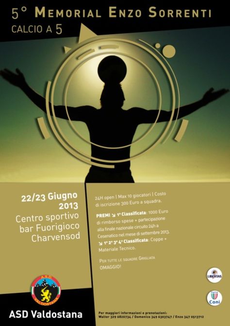 Per partecipare alla quinta edizione del Memorial Sorrenti, in programma il 22 e 23 giugno, bisognerà invece tornare all’envers, e più precisamente al Centro Sportivo di Charvensod. Un’altra 24 ore open, senza quindi limiti di tesserati che si svolgerà presso il Centro Sportivo Bar Fuorigioco di Charvensod. Il costo d’iscrizione è di 300 euro a squadra, per un massimo di 10 giocatori a équipe. Grigliata omaggio per tutti i partecipanti.