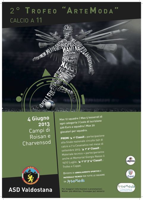Il primo appuntamento è in programma il prossimo 4 giugno 2013, con il Trofeo Arte Moda di calcio a 11, presso i campi sportivi di Charvensod e Roisan. A questa seconda edizione parteciperanno fino a dodici squadre, con un massimo di cinque tesserati di ogni categoria ciascuna. Il costo d’iscrizione è di 400 euro a squadra. Le prime due classificate verranno iscritte di diritto al Memorial Giorgio Nasso il 16 e 17 luglio.
