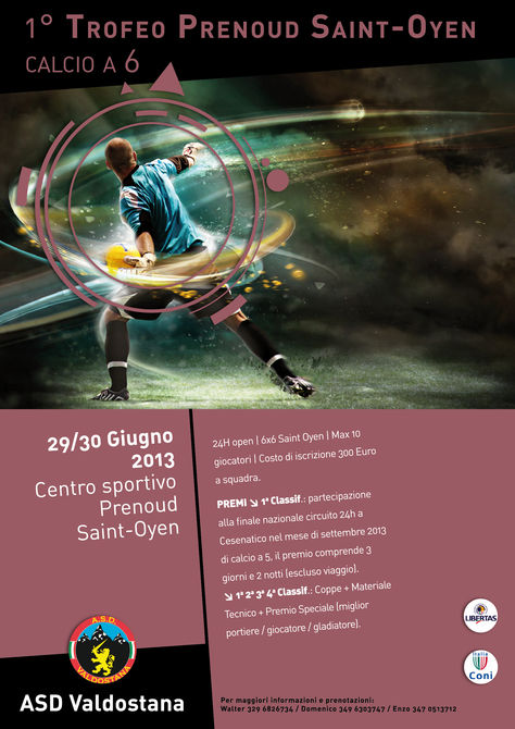 Cambio di scenario, a fine giugno, per la prima edizione del Trofeo Prenoud Saint Oyen, organizzato al centro sportivo con la formula inedita del sei contro sei. Il costo d’iscrizione a squadra, composte da un massimo di 10 giocatori, è di 300 euro. Chi si aggiudicherà la finalissima potrà usufruire di due notti in albergo, in occasione della finale di Cesenatico, mentre sono previsti premi speciali per il miglior portiere, giocatore, gladiatore e giovane.