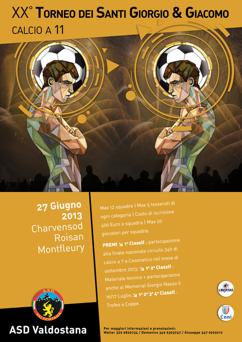 Gli sconfitti del Trofeo Arte Moda potranno rifarsi e cercare la rivincita al torneo di calcio a 11 dei Santi Giorgio e Giacomo che si disputerà sui terreni di gioco di Charvensod, Roisan e della zona Montfleury, il 27 giugno. Anche in questo caso, saranno ammesse fino a dodici squadre, con un massimo di cinque tesserati di ogni categoria ciascuna. Il costo d’iscrizione è di 400 euro a squadra e le prime due classificate verranno iscritte di diritto al Memorial Giorgio Nasso il 16 e 17 luglio.