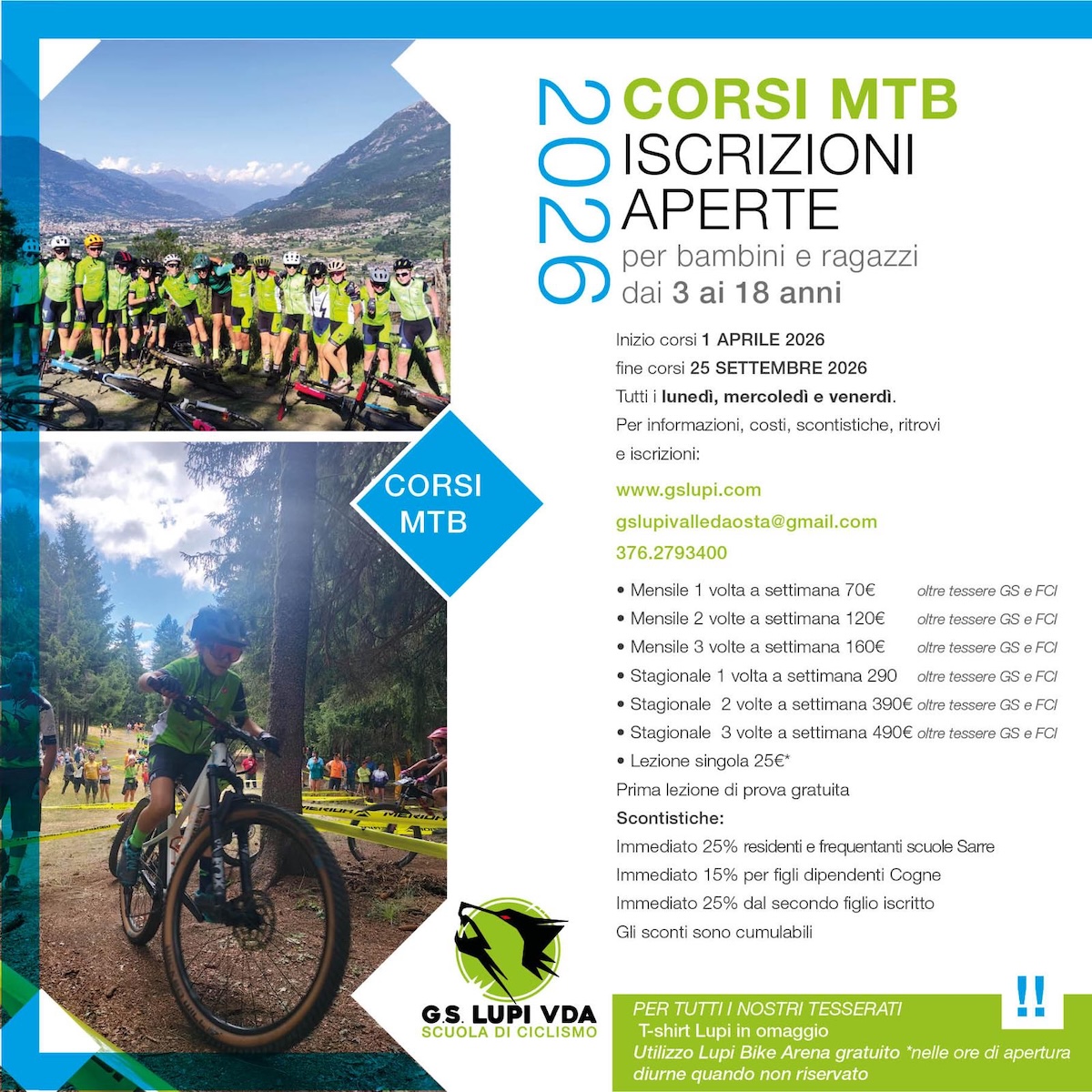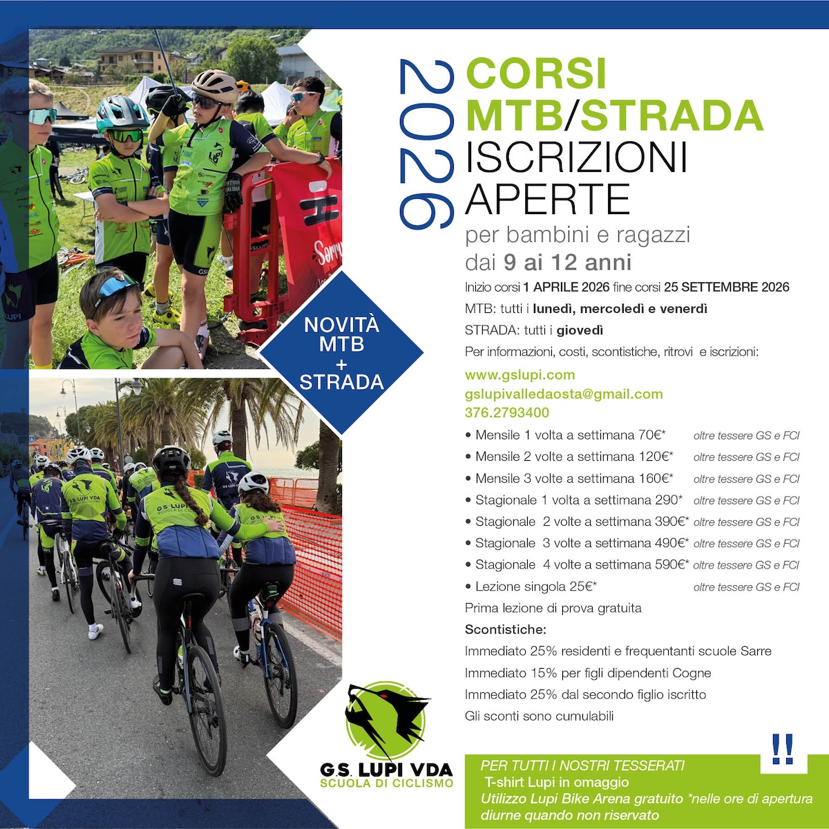 Sono confermate anche le scontistiche cumulative: il 25 percento per residenti e frequentanti le scuole di Sarre, il 15 percento per i figli dei dipendenti Cogne e un ulteriore 25 percento dal secondo figlio iscritto. Per tutti i tesserati sono inoltre previsti una T-shirt Lupi in omaggio e l’utilizzo gratuito della Lupi Bike Arena nelle ore di apertura diurne, quando non riservata.