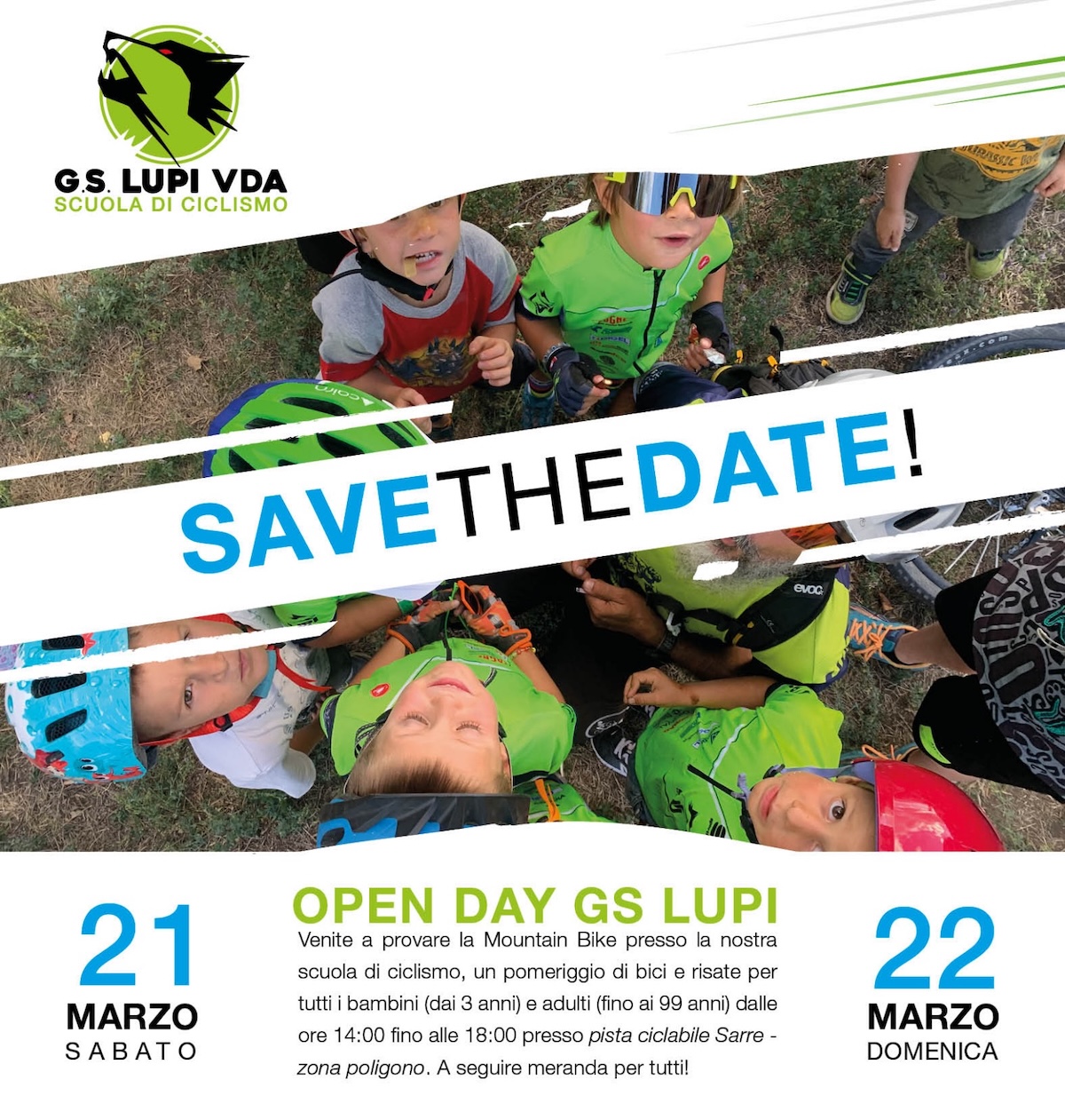 Per chi vuole conoscere più da vicino la scuola di ciclismo, il primo appuntamento da segnare in agenda è l’Open day del 21 e 22 marzo aperto a tutti, grandi e piccoli: un fine settimana pensato per provare la mountain bike, trascorrere qualche ora all’aria aperta e avvicinarsi all’attività del gruppo. L’appuntamento è alla pista ciclabile di Sarre, in zona poligono, dalle 14 alle 18, con merenda finale per tutti. In caso di maltempo, l’Open day verrà rimandato al weekend successivo.