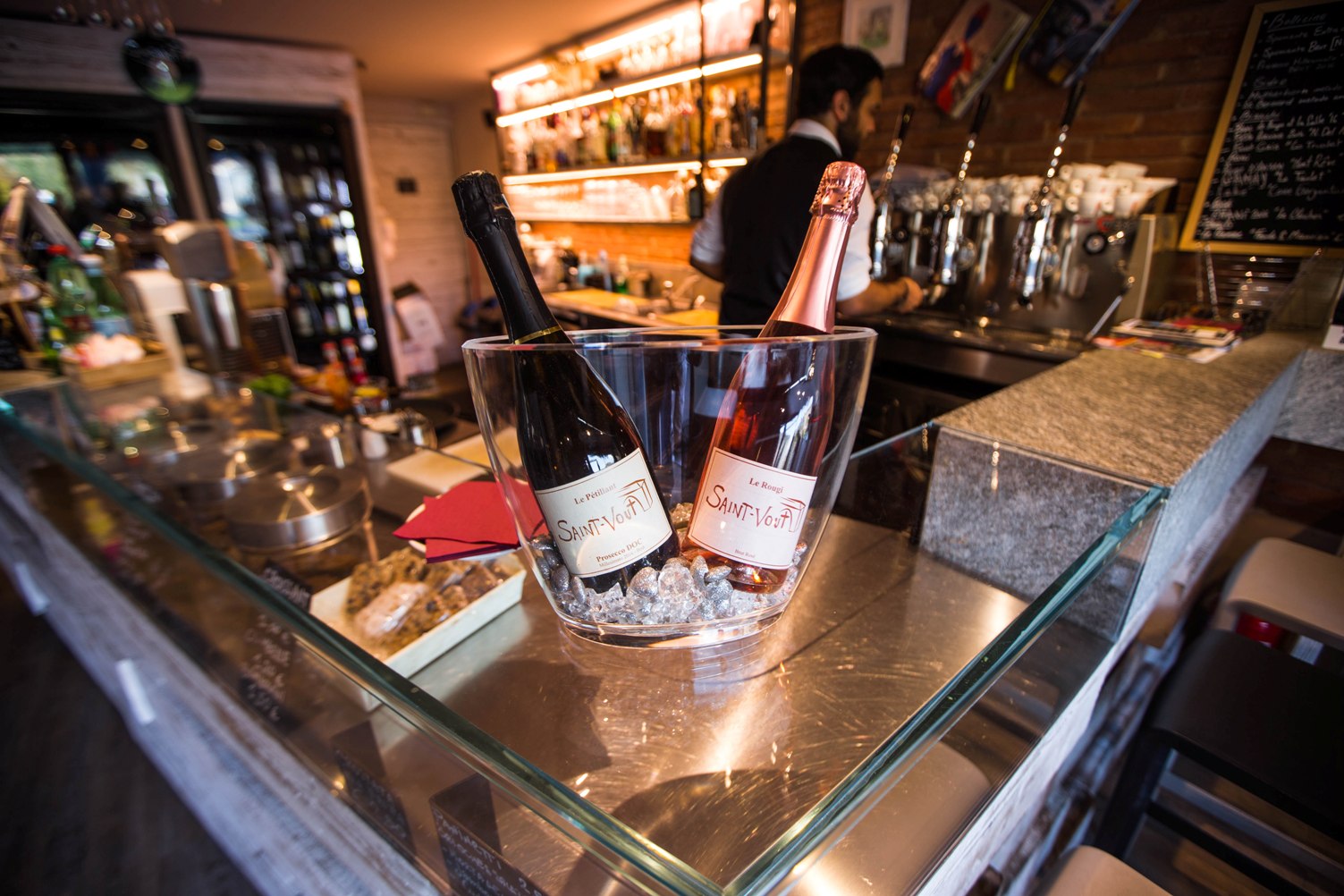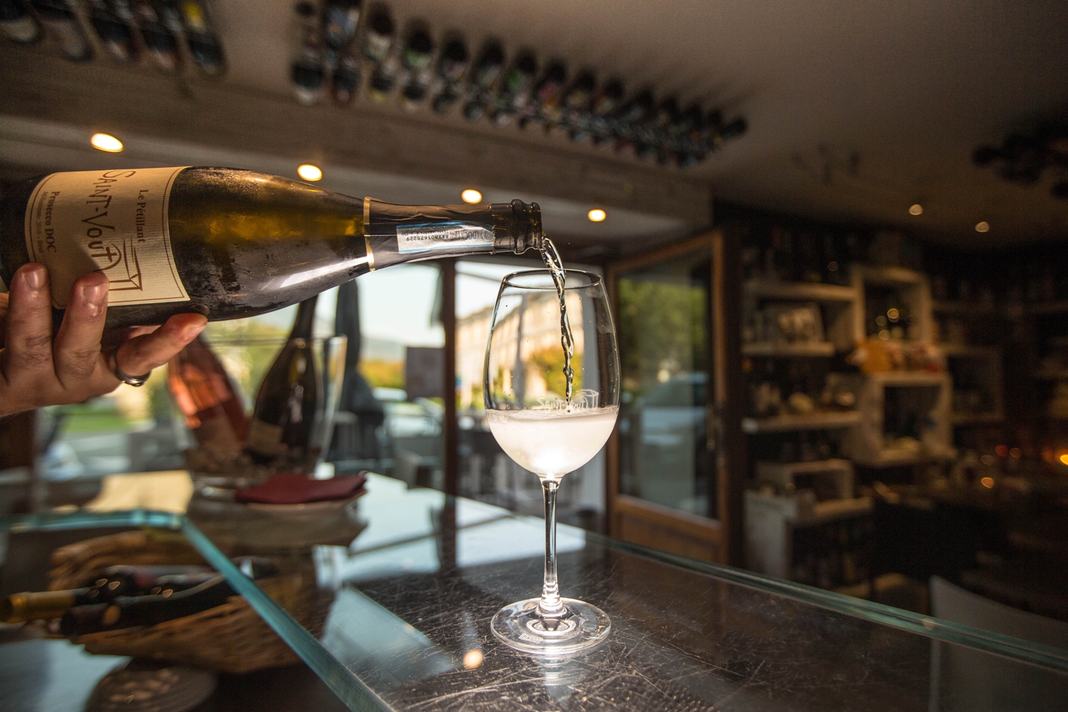Il Saint-Vout sa far convivere le attività di caffetteria, enoteca, ristorante e la vendita di prodotti tipici. E tutte le anime sono accomunate da una sola prerogativa: la qualità. Sono quasi 300 le etichette di vini valdostani proposte dall’enoteca, insieme a più di 30 tipi di birre artigianali tutte valdostane. Al bicchiere ruotano costantemente quindici etichette locali, tra metodi Charmat, metodi Classici, vini rossi, rosé e bianchi. Per i più esigenti, 8 selezioni al calice Winefit scelte tra i le migliori e più rare produzioni locali: il Prisonnier ed il Semel Pater della Maison Anselmet, l’Heritage de Lo Triolet, il nuovissimo Neige d’Or e l’intramontabile Cuvée Bois di Les Crêtes. E poi la riscoperta del sidro di mele in tutte le sue antiche e moderne sfaccettature, grazie al partner Maley.