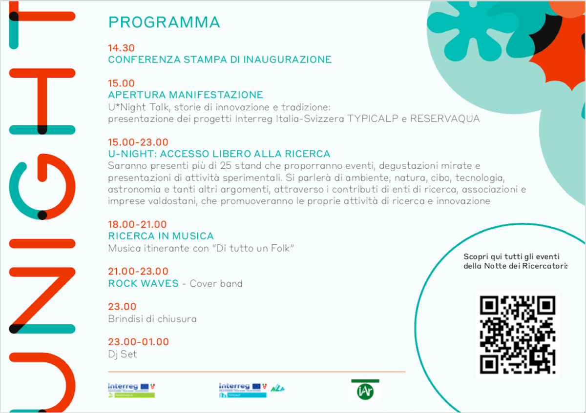 Dalle 15 alle 23, invece, accesso libero alla ricerca con la U-Night. Qui, saranno presenti più di 25 stand che proporranno eventi, degustazioni mirate e presentazioni di attività sperimentali. Si parlerà di ambiente, natura, cibo, tecnologia, astronomia e tanti altri temi, attraverso i contributi di enti di ricerca, associazioni e imprese valdostani che promuoveranno le proprie attività di ricerca e innovazione.