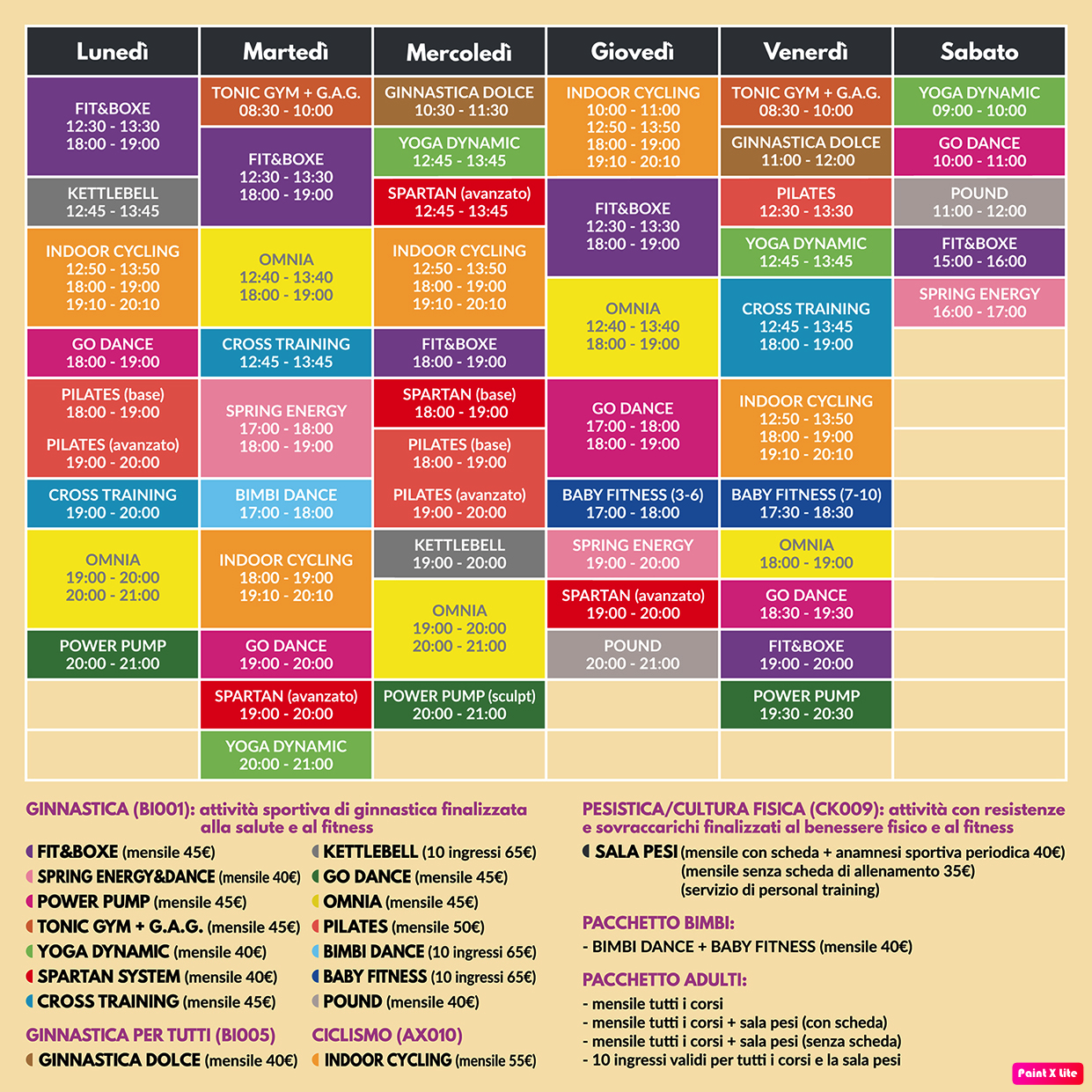 Per chi volesse fare qualcosa di più aerobico ma anche ritmato e ballato,ad esempio, con coreografie e musiche accattivanti, ci sono il Go Dance, lo Spring Energy&Dance, la Fit&Boxe e il Pound, novità di quest’anno. Mentre per quanto riguarda l’area funzionale si può scoprire invece lo Spartan System, le Kettlebell, il Tonic Gym &Gag, il Power Pump, l’Omnia e il Cross Training.