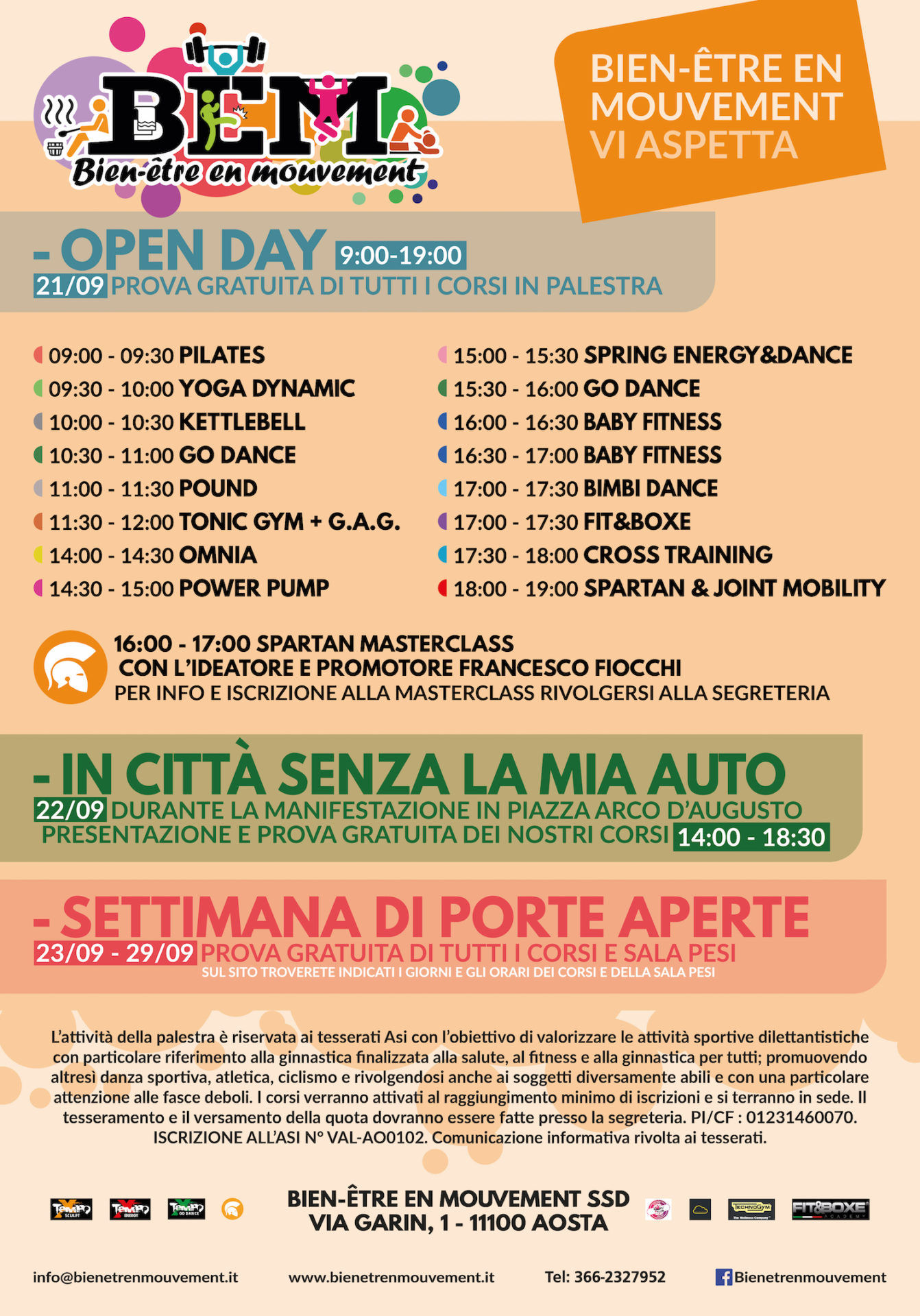 Appuntamento che verrà seguito il giorno dopo – domenica 22 settembre – dall’esibizione in piazza Arco di Augusto, ad Aosta, durante la Giornata europea “In città senza la mia auto”, mentre lunedì 23 settembre prenderanno il via i corsi veri e propri con una settimana di porte aperte totalmente gratuita.