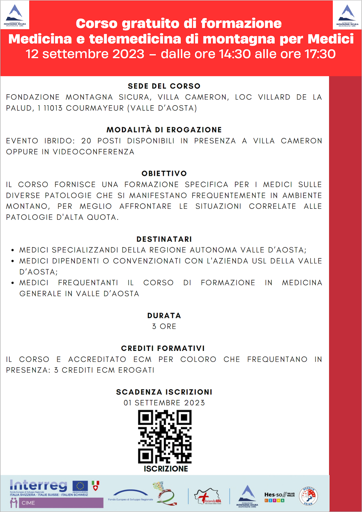 Il corso è previsto per il 12 settembre dalle 14.30 alle 17.30 a Courmayeur nella sede di Fondazione Montagna Sicura, a Villa Cameron, in località Villard de La Palud. I posti disponibili sono 20 – in presenza – per i quali sono previsti tre crediti ECM. È aperta anche la partecipazione in videoconferenza.