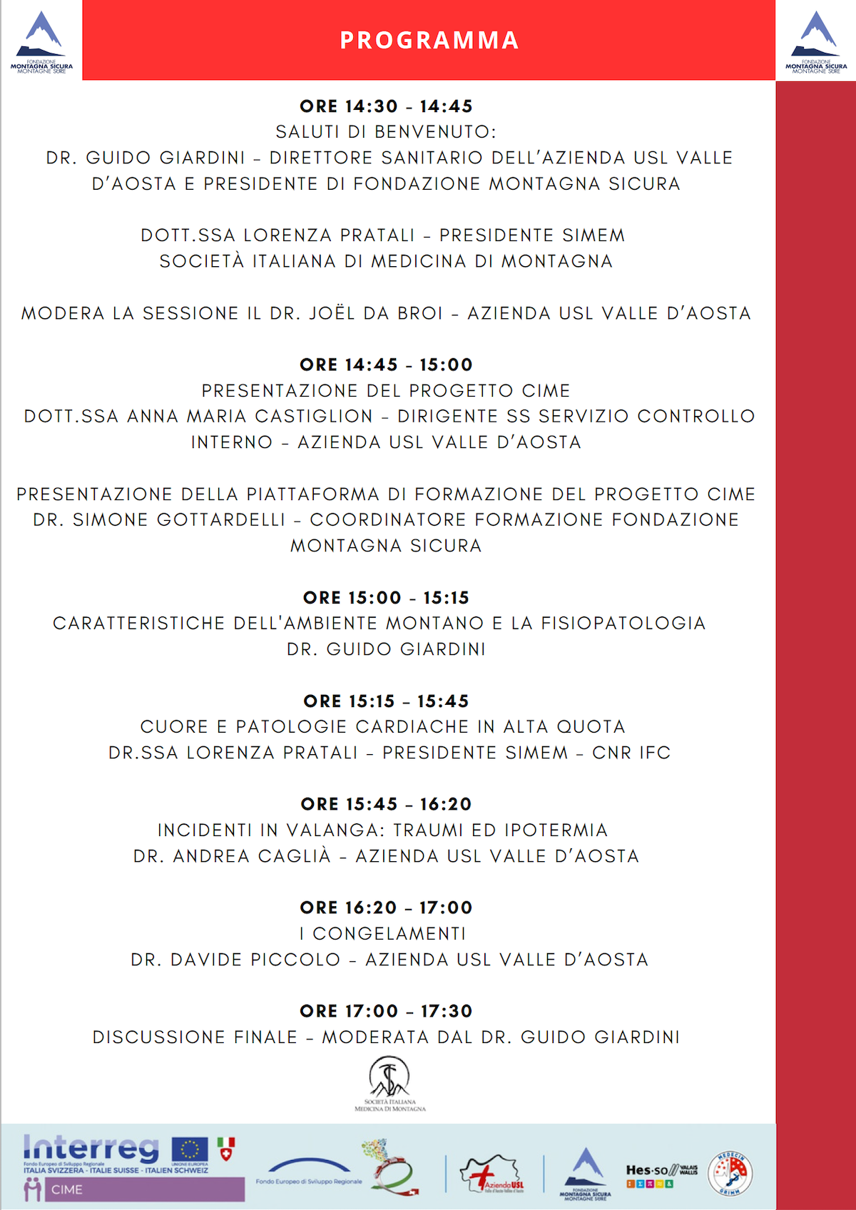 Il programma di tre ore fornirà una formazione specifica per i medici sulle diverse patologie che si manifestano frequentemente in ambiente montano per meglio affrontare le situazioni correlate alle patologie d’alta quota. Interverrà Guido Giardini, direttore sanitario dell’Usl della Valle d’Aosta e presidente di Fondazione Montagna sicura su “Caratteristiche dell’ambiente montano e fisiopatologia”.