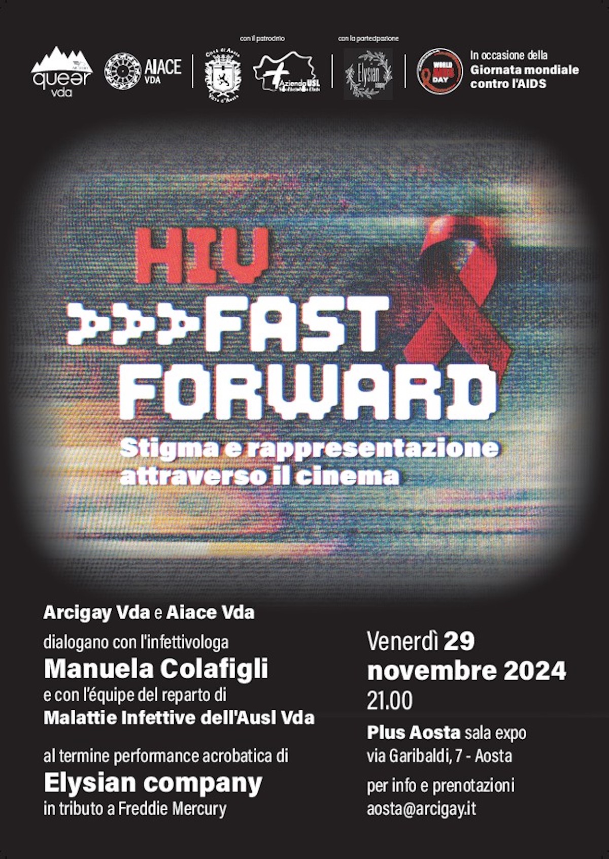 A questo si aggiunge la partecipazione all’evento “Hiv Fast forward, stigma e rappresentazione attraverso il cinema”, organizzato assieme alle associazioni Arcigay Queer VdA e Aiace VdA per venerdì 29 dicembre alla sala Expo Plus di Aosta – l’ex Cittadella dei Giovani – alle 21. La serata è patrocinata dal Comune di Aosta.