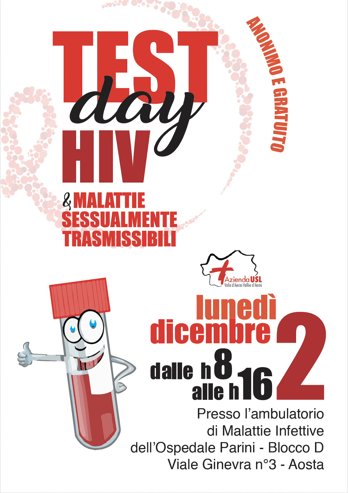 In occasione della Giornata Mondiale contro l’Hiv e l’Aids – che si celebra ogni anno il 1° dicembre –, la Struttura di Malattie Infettive dell’ospedale “Parini”, diretta dalla dottoressa Silvia Magnani, organizza per il 2 dicembre un testing day gratuito per l’Hiv e altre malattie sessualmente trasmissibili.