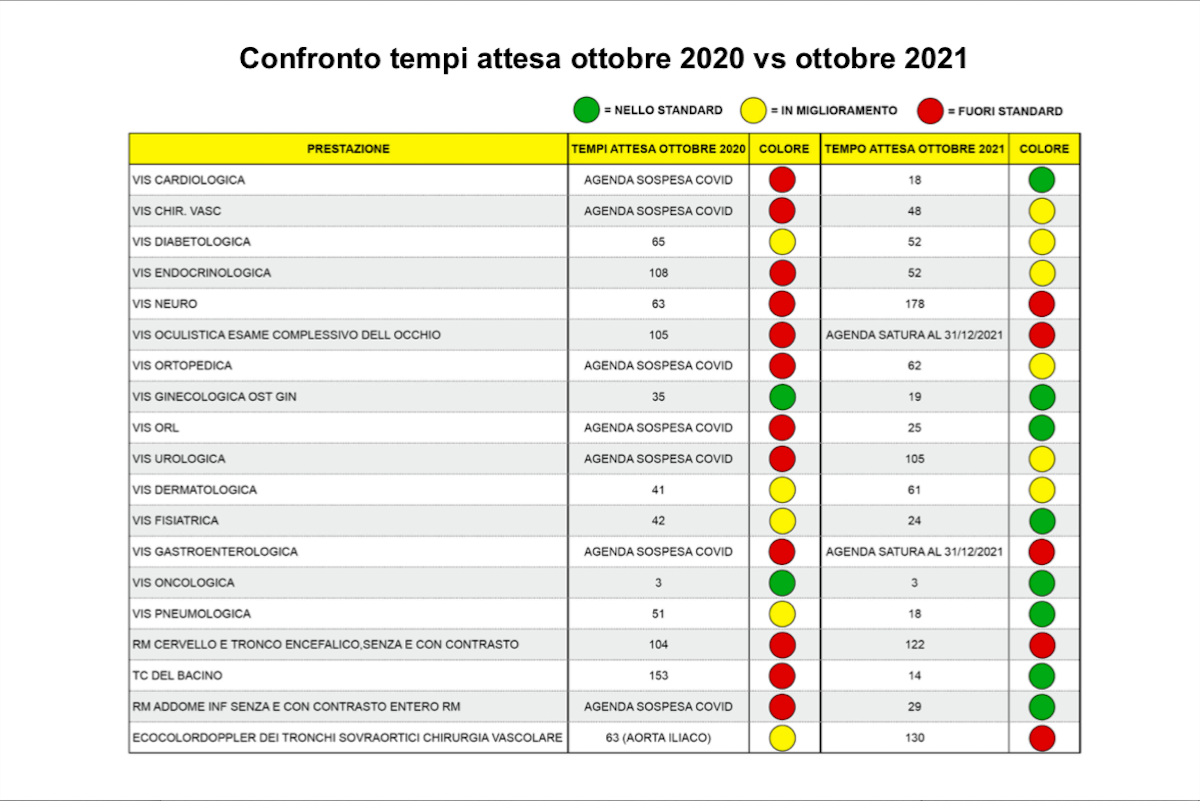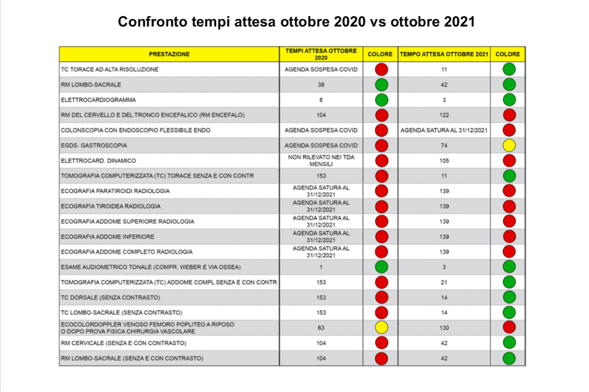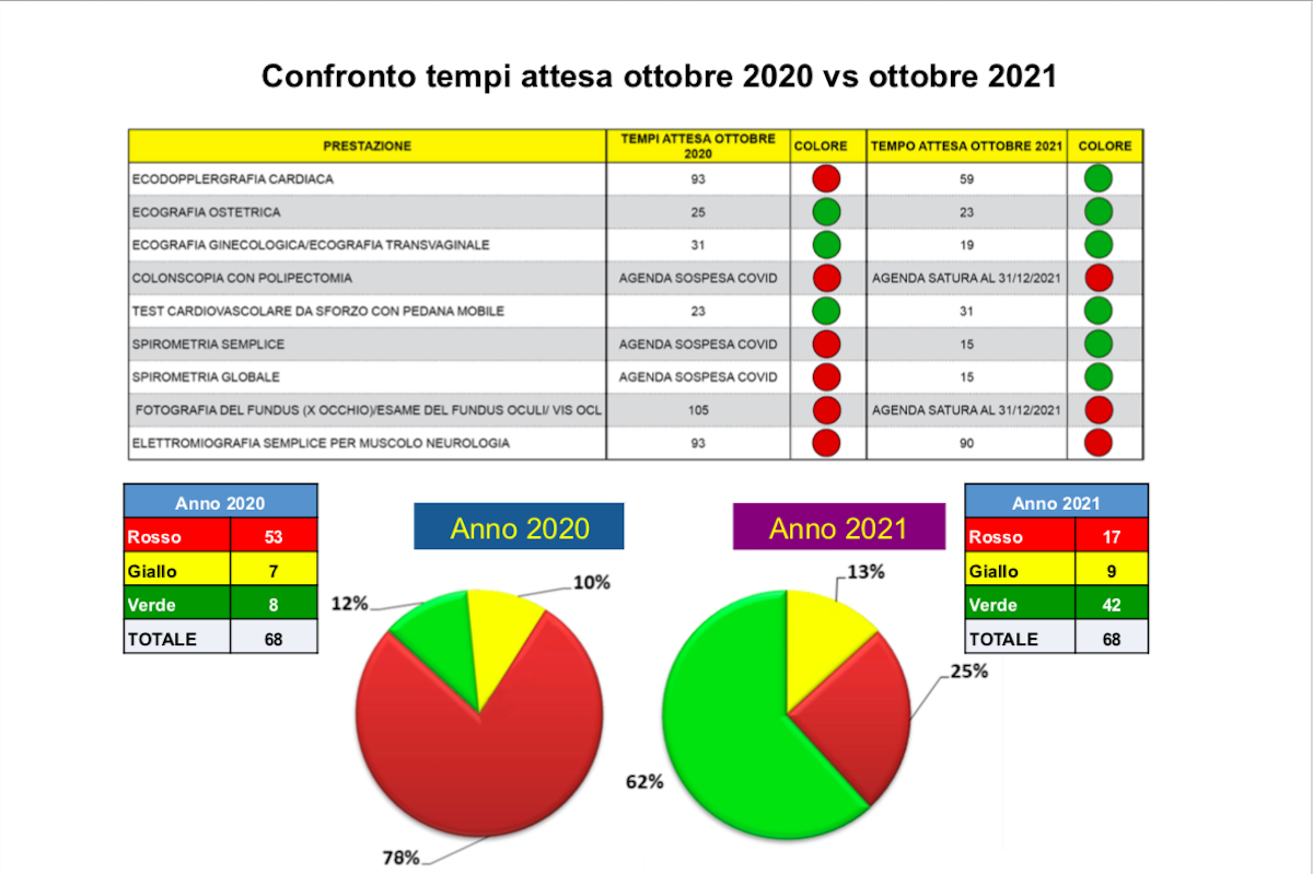 Situazione che migliora nel 2021, dove 42 prestazioni erogate su 68 – il 62% – sono tornate in “verde”. Ancora alto il ritardo, con 17 prestazioni su 68 (25%) in “rosso” e 9 in “giallo”.