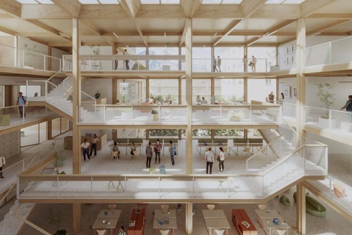 Non solo: “Le unità programmatiche con una più forte vocazione pubblica, come la palestra, l’auditorium e parte dei laboratori didattici, sono situati nell’ala sud dell’edificio, sul prospetto che maggiormente si relaziona con la città, affacciandosi direttamente su un’asse stradale strategico e ad alta circolazione come via Torino – aggiunge Sapinet –. Si trovano in una posizione facilmente raggiungibile dall’esterno e sono dotati di accesso esclusivo che ne facilita l’utilizzo. La molteplicità di ingressi e la trasparenza, insieme alla possibilità di garantire nuovi spazi alla comunità, rafforzano l’idea di un edificio accogliente capace di delinearsi come un centro civico catalizzatore di attività sociali, didattiche e culturali”.