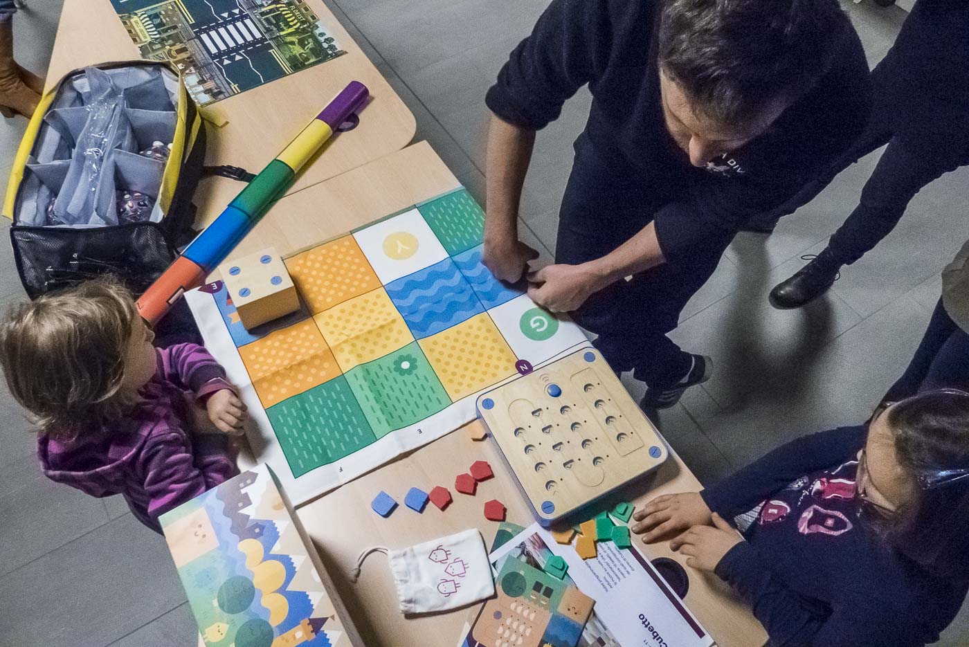 Un Cubetto (età: 4 – 11 ), un robot programmabile per bambini basato su Arduino. Si muove su ruote e si controlla tramite un “telecomando” che è una tavoletta forata in cui inserire 16 tasselli, di colori diversi, a ciascuno dei quali corrisponde un comportamento diverso di Cubetto.