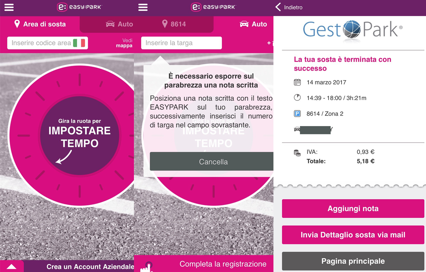 Ora tocca alla targa, ma quando con il dito seleziono il campo da riempire appare un avviso sullo schermo: “Posiziona una nota scritta con il testo EASYPARK sul tuo parabrezza, successivamente inserisci il numero di targa nel campo sovrastante”. Insomma, pago con il cellulare ma devo comunque esporre un biglietto scritto a mano: con grande perplessità recupero carta e penna dal cruscotto dell’auto, e sbrigo la pratica. Ora posso inserire la targa.