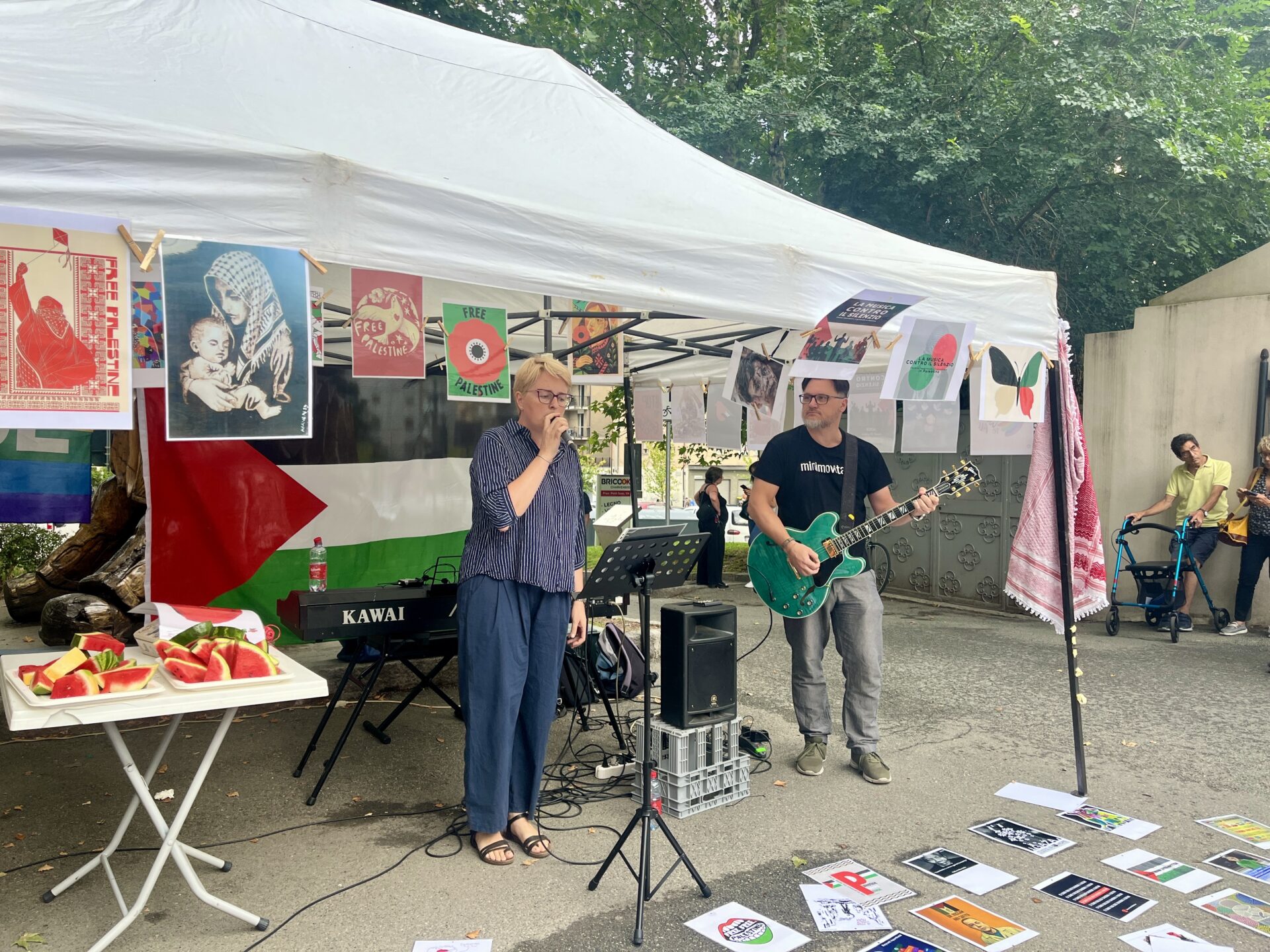 Durante il pomeriggio, sono state condivise fette di anguria, simbolo della resistenza palestinese. Il frutto, i cui colori richiamano quelli della bandiera palestinese, ha assunto negli anni dell’occupazione un forte valore identitario: un segno di espressione culturale e politica utilizzato dal popolo palestinese quando l’esposizione della propria bandiera era proibita.