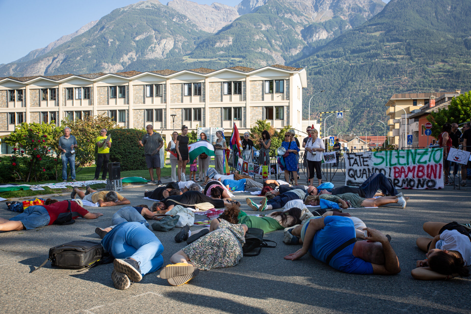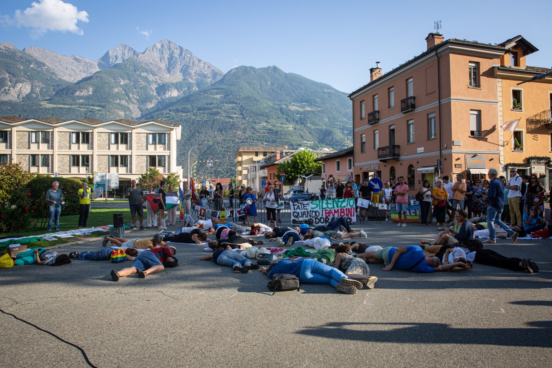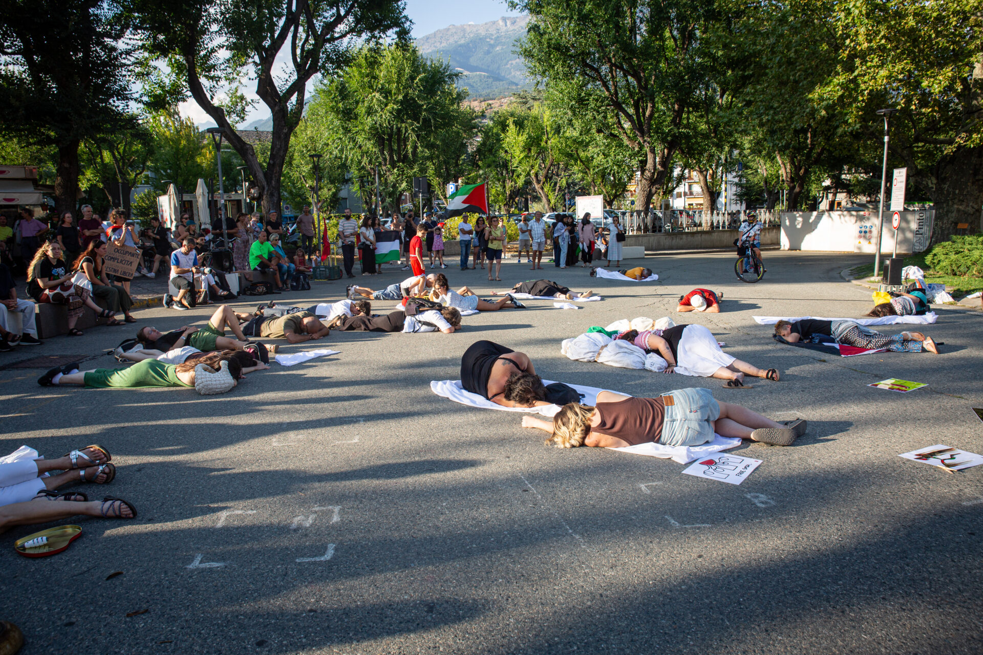 Corpi a terra, suoni di sirene e oggetti quotidiani per fare rumore, come simboli di protesta contro la guerra e di solidarietà verso il popolo palestinese. Così, lunedì 18 agosto, circa 150 persone si sono ritrovate in piazza Arco d’Augusto ad Aosta per partecipare al flashmob “Tutti i giorni a Gaza”, organizzato dal collettivo BDS Valle d’Aosta, e chiedere la pace. Un’iniziativa che ha voluto riportare l’attenzione sul conflitto in corso nella Striscia di Gaza e sulle sue conseguenze quotidiane, in particolare per la popolazione civile.
