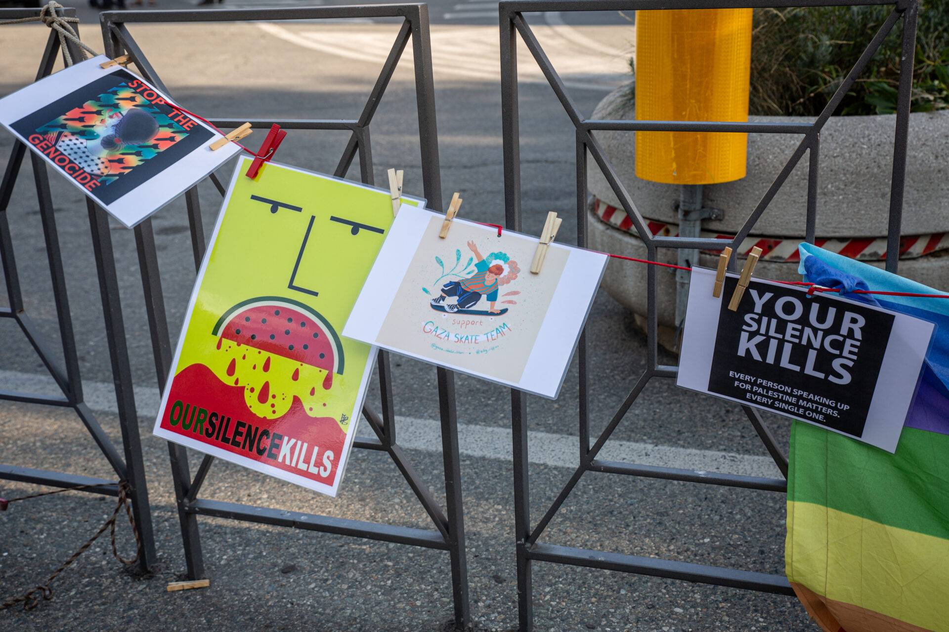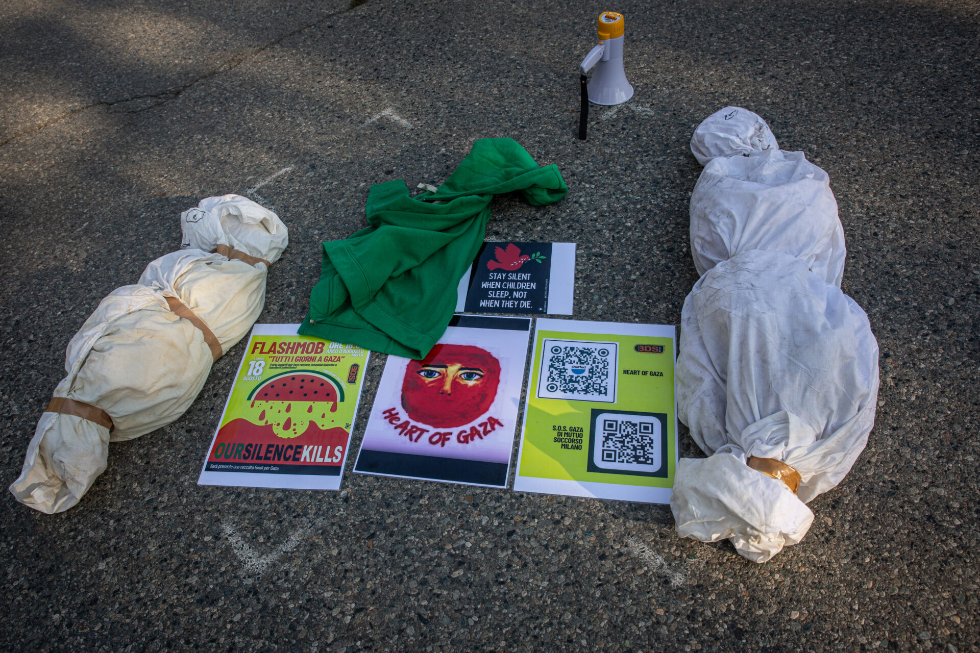 Al centro della manifestazione, una performance simbolica: decine di persone si sono stese a terra su teli bianchi, mentre dalle casse si diffondevano suoni registrati – sirene, esplosioni, rumori di bombardamenti – per evocare la quotidianità del conflitto. “Fate silenzio quando i bambini dormono, non quando muoiono” è stato uno dei messaggi del presidio, insieme allo slogan “Palestinian Lives Matter”.